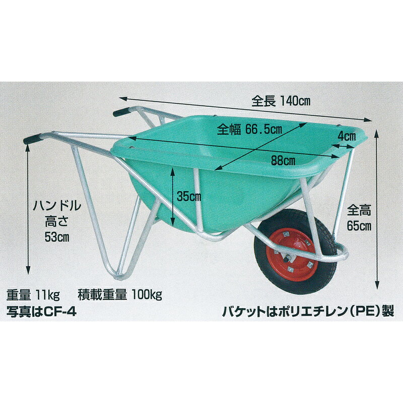 用途・特徴 ・収穫した野菜や土や肥料などの運搬作業に。 ・バケットの容量が110リットルと大きく、さらに深型なので飼料の運搬や野菜の収穫に最適です。 ・ハンドルが二重パイプ構造になっており丈夫です。 使用タイヤ ノーパンクタイヤ TR-13×3N (直径:約36cm) 商品情報 積載荷重 100kg サイズ 押手高さ:53cm全高:65cm全長:140cm全幅:66.5cmバケット長さ:88cmバケット高さ:35cmバケット幅:66.5cm バケット容量 約110リットル 自重 11kg 材質 本体:アルミ バケット:ポリエチレン(PE) 製造国 日本 JANコード 4939356398928 ご注意 ※返品不可商品 ※メーカー直送品のため、代金引換・後払い(コンビニ・郵便局・銀行)の決済方法をご利用いただけません。 ※個人宅へのお届け(都道府県を問わず)の場合別途送料が発生しますので、法人名もしくは屋号をお持ちの場合は必ず送付先にご入力をお願いいたします。 ※時間帯指定および日曜・祝祭日の配達日指定もお受けすることができません。 ※北海道・沖縄・離島・その他郡部(中継必要となる地域)は別途送料が必要となります。 ※また、配達不可地域がございます。あらかじめご了承ください。
