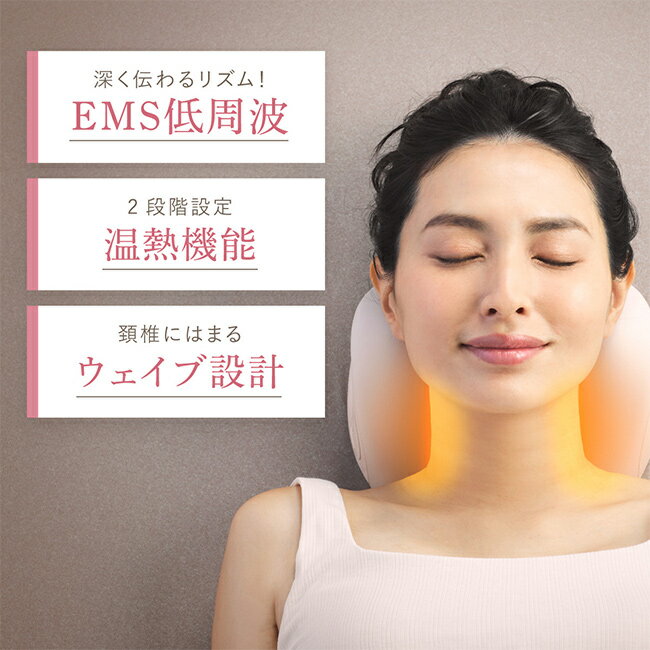 WAVEWAVE NECK REVIVE ネックリバイブの解説 温熱機能とEMS機能により、寝るだけで首を温めながらストレッチ&ケアすることができます。 ゆったり首を預けるだけで姿勢を整える、波のような曲線設計を採用。 角度は緩やかな38°、しっかりケアしたい45°からお選び頂けます。 本体には温熱パッドが付いているので、約5分で首元を広域かつ均等に温め、じんわりリラックスすることができます。 温度設定は低・高2段階からご選択ください。低温モードは36~40℃。高温モードは40~44℃。 さらに、EMS機能(低周波)で、硬くなりがちな首元に心地よい刺激を与えます。 5種類のモードと16段階の強度レベルからご選択頂けます。 また、温熱機能とEMS機能はOFF設定で使用することもできます。 床に置いて仰向け姿勢での使用はもちろん、椅子の背もたれに差し込むことができるので、デスクワークの休憩中に座ったまま使用することも可能です。 パソコン作業などで緊張した首元ケアにぴったり。 毎日、仕事や家事や育児を頑張る方へ。 贈り物としてもお喜び頂けます。 WAVEWAVE NECK REVIVE ネックリバイブの詳細 商品名: WAVEWAVE NECK REVIVE ネックリバイブ 説明: 首 EMS 低周波 温熱 ストレッチャー リラックス 枕 温め ストレッチ ネックストレッチャー ネックピロー 温活 オフィス デスクワーク パソコン 作業 PC作業 仕事 休憩 用途・場所: 自宅 オフィス 職場 デスクワーク パソコン作業 PC作業 首 姿勢 正しい姿勢 サポート ホームエステ リラックス 癒し カテゴリー: 健康家電 EMS家電 色: ピンク サイズ: 小型 ミニ コンパクト 小さい 小さめ 対象: 大人 おとな 女性 女性用 女 婦人 婦人用 彼女 奥さん 母 ママ お母さん 祖母 おばあちゃん 男性 20代 30代 40代 50代 60代 ギフト用途: ギフト プレゼント 贈り物 母の日 母の日のプレゼント 母の日ギフト 父の日 父の日のプレゼント 父の日ギフト クリスマス クリスマスプレゼント 誕生日 誕生日プレゼント バースデー 敬老の日セット内容 本体、リモコン、品質合格書、充電コード、取扱説明書および保証書 サイズ(約) [本体]23×21.2×10.9cm[リモコン]7.6×3.6×1cm 重量(約) 470g 素材 ポリウレタンフォーム 仕様 [定格電力]4W[定格電圧]5V[機能]音声機能付き、15分自動タイマー付き[充電口]USD Type-C[リモコン電池]ボタン電池CR2032×1(別売り) 原産国 [デザイン・企画]日本[製造国]中国 保証期間 ご購入後12ヶ月 注意 ※ディスプレイの環境上、実際のカラーが再現できない場合がございます。※本製品は医療機器ではございません。※妊婦、授乳中、疾患のある方、未成年者は使用禁止。※体内植込型医療機器を使用している方は使用禁止。※本製品の電極パッドには温熱機能があり首に長時間(15分以上)使用すると低温やけどを引き起こす恐れがあります。 WAVEWAVE フェイシャルリリースガン WAVEWAVE フィジカル リリースガン リトル WAVEWAVE EMS ポケットヒートネック2