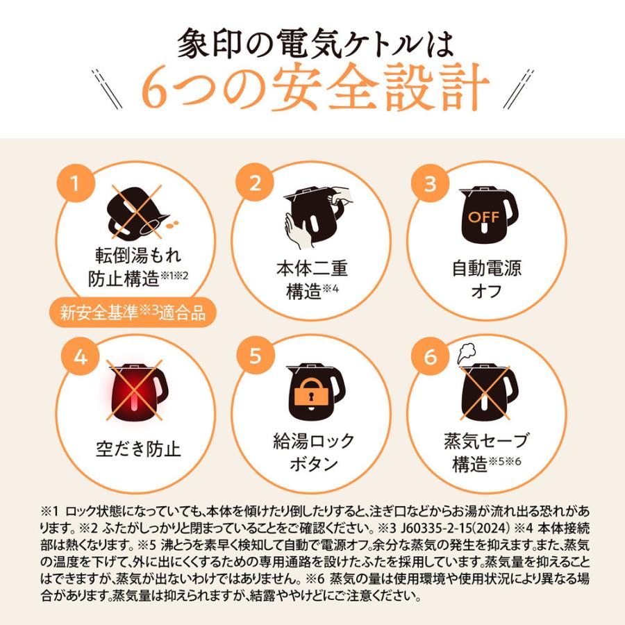 ■6つの安全設計 ・転倒湯もれ防止構造 ・本体二重構造 ・自動電源オフ ・空だき防止 ・給湯ロックボタン ・蒸気セーブ構造 ■急な来客や料理の下ごしらえなど、たくさんのお湯を早く沸かしたいときに便利な「たっぷり容量タイプ」 ■清潔!ほこりの入りにくい「注ぎ口 ほこりブロック」 ■必要な分だけすぐに沸く「ハイパワー1300W」「カップ1杯(140mL)約60秒(室温23℃・水温23℃・定格消費力)」 ■スムーズに取りはずせるから、給水もお手入れもらくらく「軽くはずせるふた」 ■ひと目でお湯の量を確認できる「見やすい水量窓」 ■持ちやすい形状のハンドル ■流線がなめらかで注ぎやすい「なめらか注ぎ口」 ■湯沸し中がひと目でわかる「湯沸かしランプ」 ■取り扱い説明書が確認できる二次元コードつき ●サイズ(約):幅22.5×奥行16.5×高さ24cm(電源プレート含む:26cm) ●重量:約1.0kg(電源プレート含む:1.2kg) ●容量:1.5L ●消費電力:1300W ●コード長:約1.3m