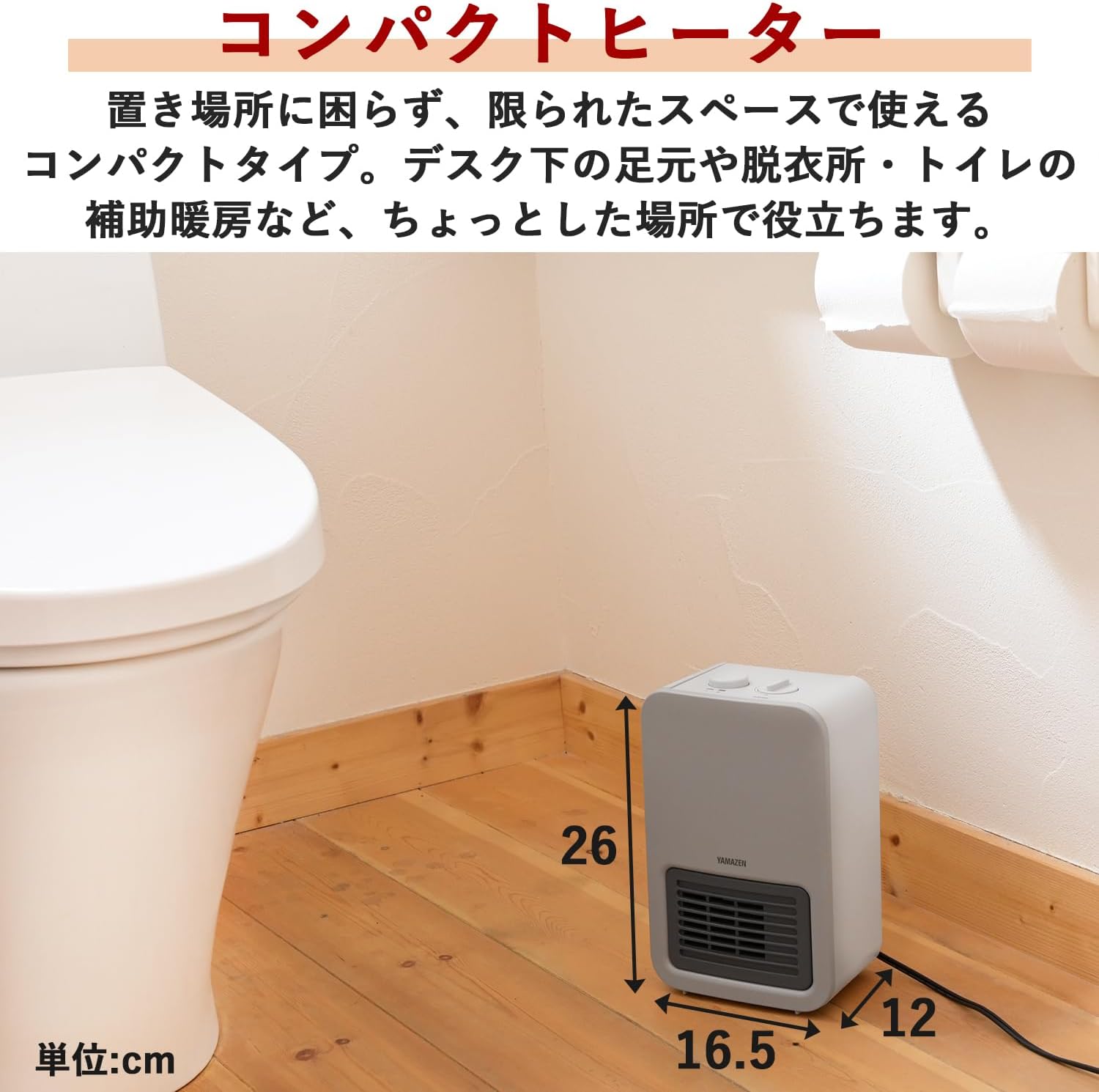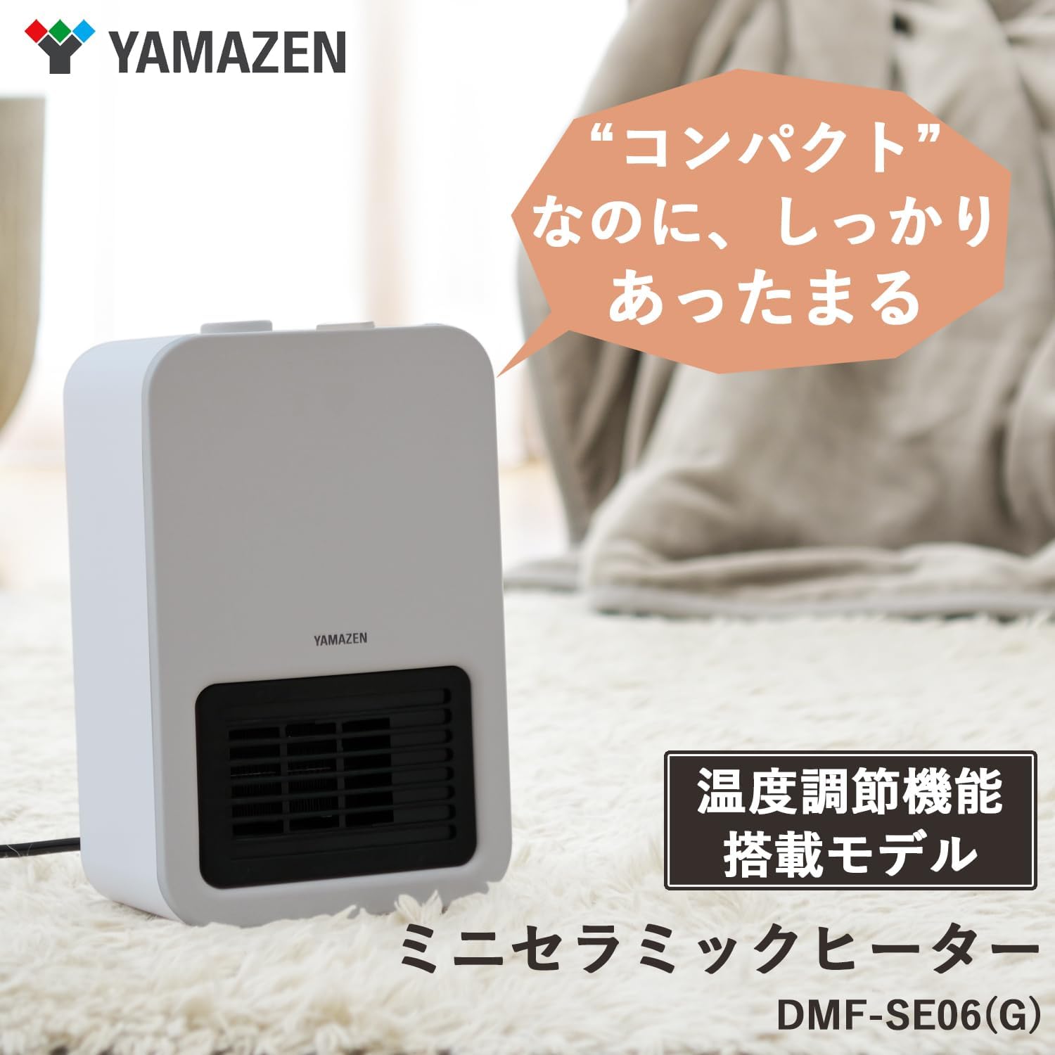 商品情報メーカー名山善サイズ縦30cm 横21cm 奥行16cm商品説明●空気を汚さずお部屋をあたためることができるセラミックヒーター。●デスク下の足元や脱衣所・トイレの補助暖房に便利なコンパクトサイズ。●スイッチONですぐに温風が出る速暖タイプ。●その日の気温やお好みに合わせて、弱~強まで無段階で設定できる温度調節機能搭載。※ヒーターの入/切で温度調節をするため、温度調節つまみを「低」「高」どちらに合わせても、吹き出す温風の温度は同じです。●電源ON/OFFはワンタッチボタン、温度調節はロータリスイッチ式のシンプル操作。●静かな場所で使用しても運転音が気にならない静音設計。●本体背面に吸気フィルター付。●誤って転倒させてしまっても、自動で電源がOFFになる転倒OFFスイッチ機能搭載。[山善] セラミックファンヒーター セラミックヒーター ミニタイプ 足元 速暖 小型 静音 トイレ 洗面所 脱衣所 温度調節機能 転倒OFFスイッチ グレージュ DMF-SE06(G) 4550533026955 5