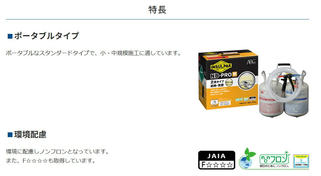 発泡ウレタンシリーズ「インサルパック」の新商品のノンフロン2液スタンダードタイプ。 片手で持ち運べるポータブルタイプで、厚み20mmの壁面吹付けなら約10m2施工が可能です。 【特長】 ・ポータブルなスタンダードタイプで、小・中規模施工に適しています。 ・環境に配慮しノンフロンとなっています。また、F☆☆☆☆も取得しています。 【使用用途】 ●壁面の断熱施工 ●天井の断熱施工 ●床下の冷気対策 ●リフォーム時の壁面の結露防止 ●床の断熱施工 ●押入れのカビ防止 品番:NBM 発泡体積:180〜230L・厚み20mmで約10m2 熱伝導率:0.022W/mk フォーム色:クリーム 容量/セット:7.2kg 入数:1セット 発泡ガス:HFO-1233zd