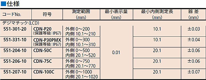 【特長】 ●(ISO-9001)一般校正付 ※校正に関しましてはノイタービラック社校正(ISO)にて作成しております。JCSS校正(メーカー校正品)ではございません。 ●書類に関しましては検査成績書、校正証明書、トレーサビリティ体系図の3点になります。 ●0.01mmまでデジタル表示、誰にでも誤りのない読み取りができます。 ●絶対原点を持つABSスケール内蔵のため、電源ONごとのゼロセットは不要です。 【用途】 ●誤差少ない内径測定に。 【仕様】 ●測定データ出力端子あり ●保護等級:IP67 ●メーカーコード:551-331-10 ●測定範囲(mm):外側 0〜300/内側 10.1〜310 ●器差(mm):±0.04 ●最小表示(mm):0.01 ●デプスバー:無 【注意】 ※校正の際、法人名が必要となりますので、 個人で購入される場合は必ず法人名を「備考欄」にご記入ください。 ※画像は代表画像を使用しています。 品番をご確認の上、お求め下さい。 ※製品・技術に関するご相談は、ミツトヨ問合せ窓口 電話050-3786-3214へお問い合わせください。 ※付属の電池はモニタ用の為、寿命が短い場合がございます。使用する際は市販の電池に交換して下さい。 【納期】約10〜14日間で出荷予定。