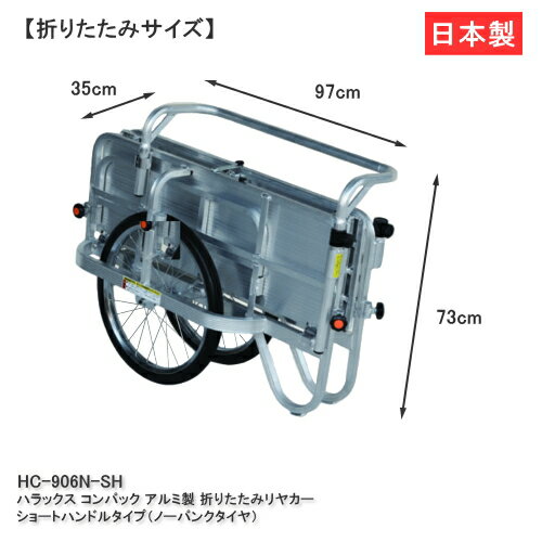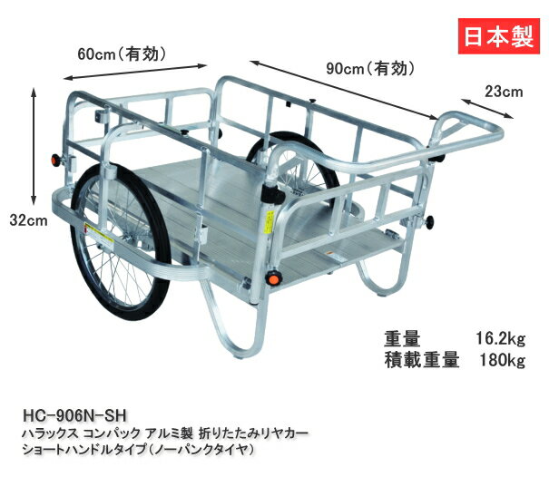 ※パッケージおよび仕様は予告なく変更する場合がございます。 ※ 本製品は代金引換はご利用いただけません。 ※ 大型商品のため時間指定ができません。 ※ 沖縄、離島の送料は、別途お見積いたします。 ※ お客様のご都合による返品交換はできません。 商品説明 サイズ 荷台全長:90cm(有効) 荷台全幅:60cm(有効) 荷台高さ:32cm ハンドル長:23cm 折畳サイズ(収納寸法) 長さ:97cm 幅:35cm 高さ:73cm 重量 約16.2kg 積載荷重 180kg タイヤ 20インチ ノーパンクタイヤ(TR-20×1.75N) 正しく安全にお使いいただくため、ご使用前に必ず「取扱説明書」をよくお読みください。アルミ製 折りたたみリヤカー HC-906N-SHショートハンドルタイプ ●ショートハンドルタイプ リヤカー ショートハンドルタイプリヤカーは、標準ハンドル(ロングハンドル)に比べ小回りが利き、狭い場所での走行や後方向へ押しながらの走行に便利です。 ●ノーパンクタイヤ採用! 使用中はもちろん、いざ使おうと思った時のパンクは困りもの。ノーパンクタイヤならパンクの心配なし! ●車に積んで移動OK! 防災、イベント会場での荷物運び等、リヤカーの収納場所から遠い所で使用する際に、コンパクトに折り畳み車に積んで運べるのでとっても便利。 ●省スペース収納OK! リヤカーをそのまま収納しようとすると、どうしても倉庫のスペースをとってしまいます。このリヤカーならコンパクトに折り畳めるので、収納も楽で倉庫を広く使うことができます。 ●アルミ製で軽い! 地域行事、学校行事、廃品回収等、女性や子供が使用することが多い行事に。従来のリヤカーに比べて軽量なので運搬が楽で使いやすい。