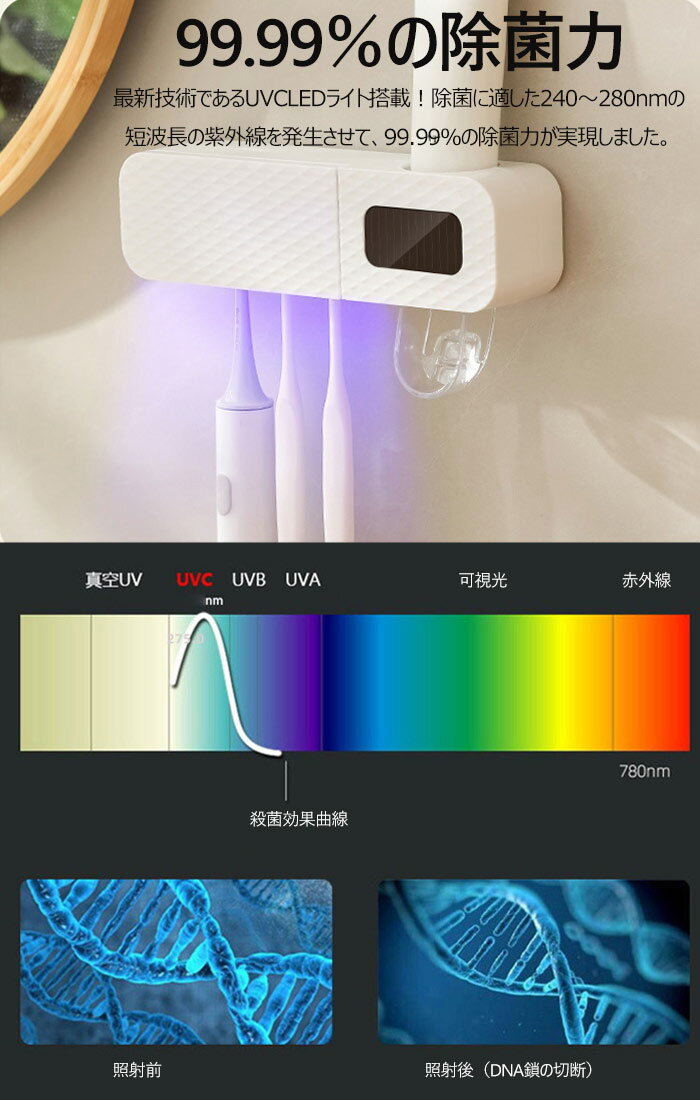 歯ブラシ除菌器 歯ブラシホルダー 歯ブラシスタンド UVC除菌 壁掛け式 歯磨き粉ディスペンサー カビ防止 梅雨対策 歯ブラシ除菌ケース UBS充電式 自動タイマー 自動電源オフ機能 穴開け不要 コンパクト 一台多役 電動歯ブラシ対応 家族用 3本対応 旅行に適用