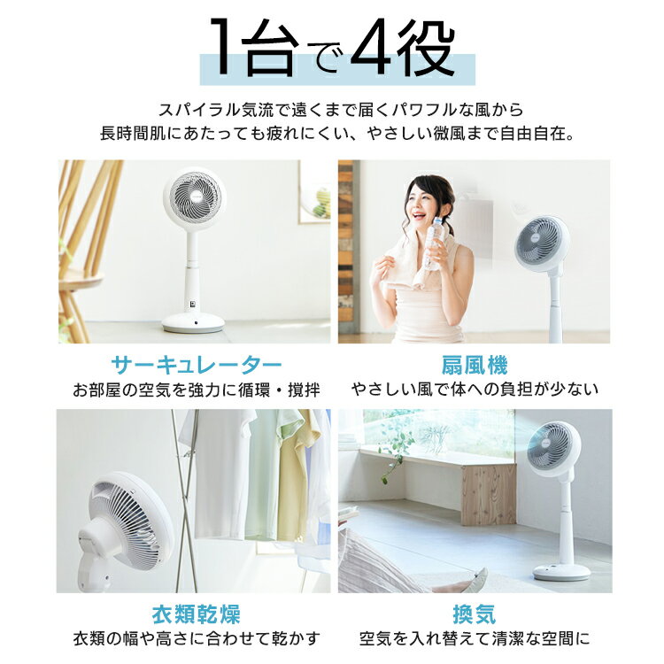 1台で2役のサーキュレーター扇風機。◆風量は10段階連続モードでは10段階、リズム・おやすみのモードでは3段階に切り替えられます。◆タイマー機能便利な入タイマー・切タイマー付き。◆オールシーズン使える連続モードで、サーキュレーターとしての基本の使いかたができます。冷暖房の効率が上がり、省エネにも繋がります。◆お手入れがしやすい前面のカバーが簡単にとりはずせるので、お手入れがとても簡単です。●商品サイズ(cm)幅約27×奥行約27×高さ約64〜75●本体質量約2.7kg●電源AC100V、50/60Hz●消費電力32W●適用畳数(目安)30畳●風力切替10段階●送風モード連続・リズム・おやすみ●首振り上下左右(60°・90°・120°)●タイマー入/切●高さ調節4段階●電源コード長さ約1.7m(検索用:首振り 送風 おしゃれ 静音 扇風機 サーキュレーター 冷房 暖房 省エネ 首ふり 空気循環 涼しい 循環 4967576463782) 最強翌日配送対象商品に関するご案内 最強翌日配送対象商品・対象地域に該当する場合は最強翌日配送マークがご注文カゴ近くに表示されます。 最強翌日配送可能なお支払方法は【クレジットカード、代金引換、全額ポイント支払い】のみとなります。 下記の場合は最強翌日配送対象外となります。 ・15点以上ご購入いただいた場合 ・時間指定がある場合 ・ご注文時備考欄にご記入がある場合 ・決済処理にお時間を頂戴する場合 ・郵便番号や住所に誤りがある場合 ・最強翌日配送対象外の商品とご一緒にご注文いただいた場合 ・お届け先住所文字数が40文字以上の場合
