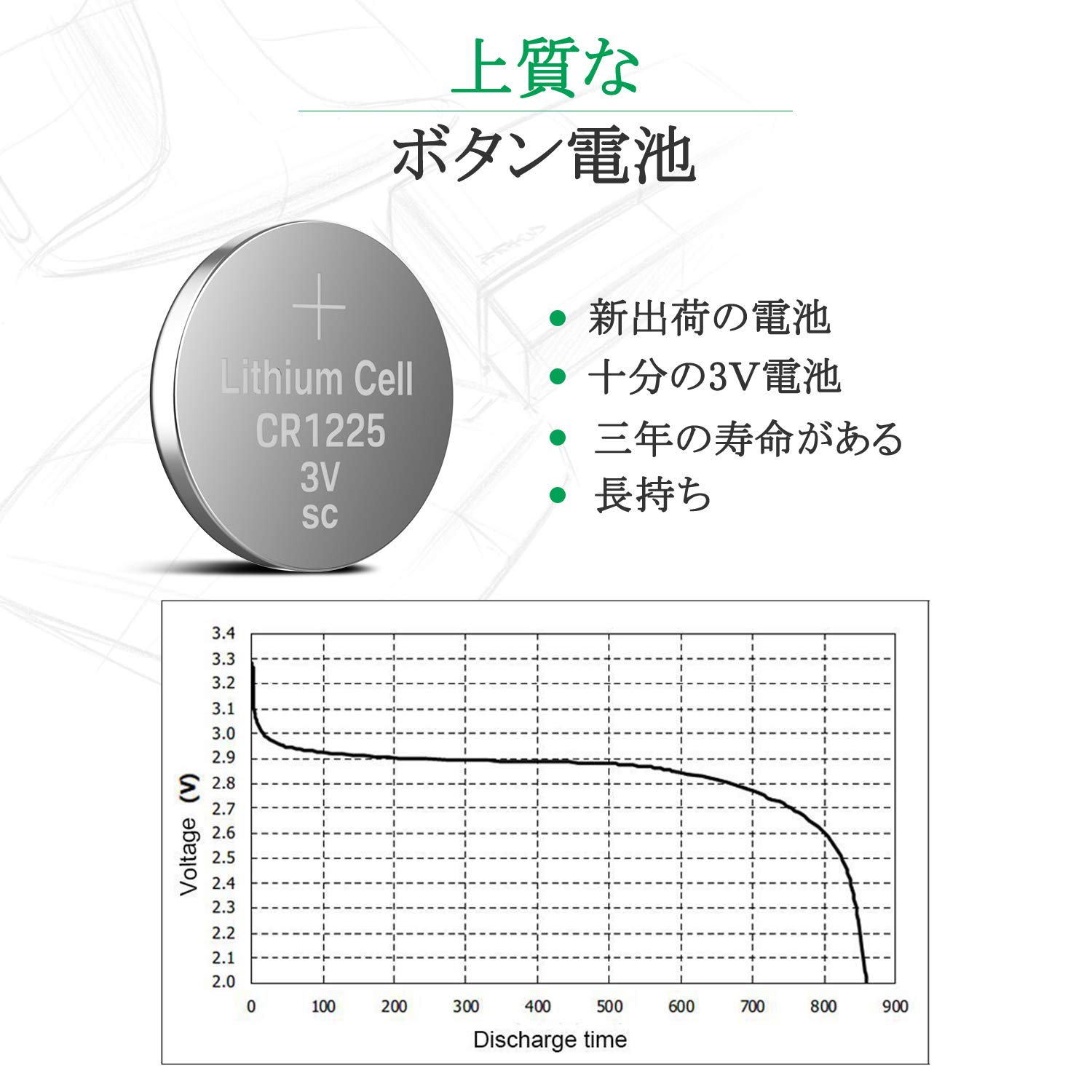 ・ WR1510・「電池の特徴」高品質R15電池サイズ:1*.5 電圧:3V 1セットに10個入り 水銀ゼロシリーズ・「耐久性と信頼性」R15リチウム電池は優れた保存性と信頼性を持っています。 リチウムと二酸化マンガンの組み合わせにより、化学的に非常に安定しています。3V+の高い電圧を持ち、長期間使う、耐久性に優れた、電量や電圧が十分です。3年間の貯蔵寿命・「幅広い用途」、時計、電卓、電子手帳、体温計、携帯ゲーム機、キーレスエントリー、補聴器、光るキーホルダー、ドア、車のキー、竿先ライト、スマートの鍵、光る携帯ストラップ、電気浮きなどに対応されるR15コイン型リチウム電池です。・「得られた製品」新出荷の電池、更なる安全性を考えた簡易の省資源エコパッケージを採用した製品を得られる。パッケージもコンパクトで保管しやすいです。・「保証サービス」弊店からご購入いただいた製品は、ライフタイム保証となります。お買い上げ日より正常な使用状態で、万一不具合不良が生じたら、期間を定めず返品/交換サービスが受けられます。 商品保証 iBは高品質の商品と顧客第一のカスタマーサービスを目指しております。ご購入された商品はお届けから何かがございましたら、お気軽にお問合せください。お客様からのお問い合わせ内容に応じて対応させていただきます。 お問い合わせ 「アカウントサービス」⇒「注文履歴」⇒「販売元」⇒「質問する」から、お気軽にお問い合わせください。