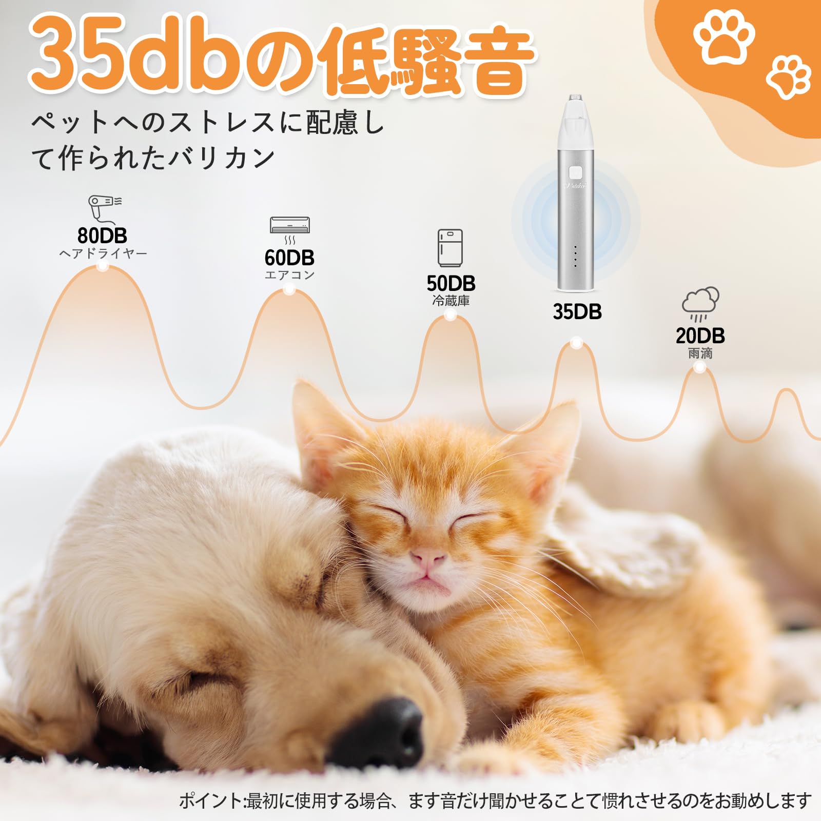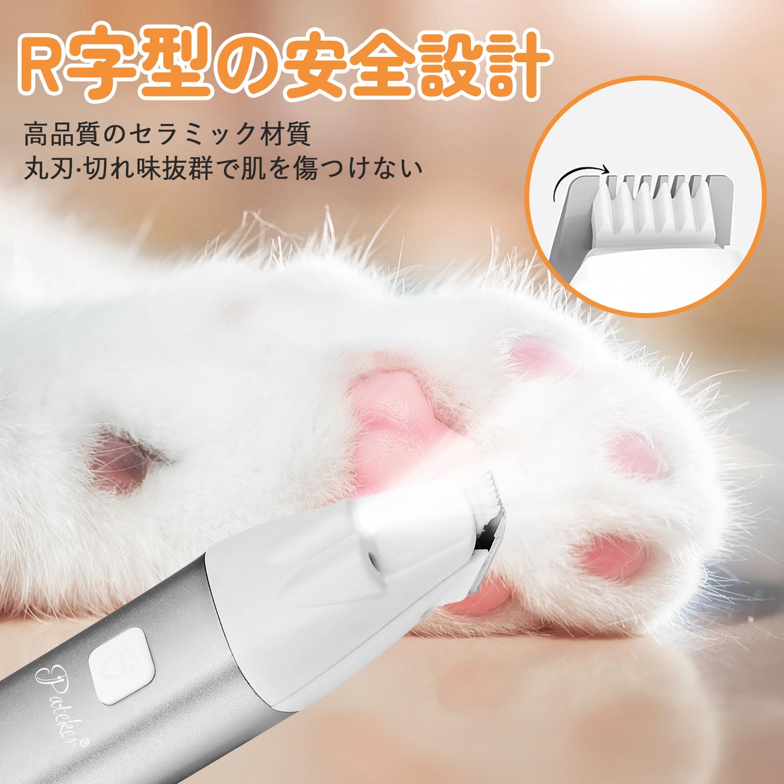 【皮膚を傷つけない安全設計&部分カットに最適】こちらのペット用バリカンは、9mmの丸刃を採用しており、接触する部分は特殊なR角処理が施されている安全に使用することができます。刃幅が9mmとコンパクトなため、足裏、肉球、耳の周り、顔の周り、尾の周りなどの細かい部分のトリミングがスムーズに行えます。犬にも猫にも対応した、使いやすいペット用バリカンです。【優れた切れ味&静音設計&便利なLEDライト搭載】この犬 バリカンは、高速モーターを搭載し、優れた切れ味でさまざまな毛を簡単にカットできます。初心者の方でも自宅で快適にトリミングが可能です。また、低騒音設計により、大切なペットを驚かせることなく、スムーズで安定したトリミングが実現します。初めて使用する際は、まず音に慣れさせることをおすすめします。さらに、LEDライトが搭載されており、細かい部分のトリミングが明るく見やすくなり、よりきれいに仕上がります。【USB充電対応&簡単操作のワンタッチ設計】この猫 バリカンにはType-Cケーブルが付属しており、バッテリーが切れた際に簡単に充電できます。コードレス設計なので、動かしている最中にケーブルがペットに引っかかる心配がなく、自由にどこでもトリミングできます。ワンタッチで簡単にオン?オフできるため、初心者の方でも手軽に使えます。また、ボタンを一度押すとLEDライトが点灯し、隙間もはっきりカット。二度押すとレ一ザ一が点灯し、ペットと一緒に楽しく遊ぶ。三度押すとウッド灯が点灯し、皮膚状態をチェックできます。【お手入れ簡単&コンパクト設計】ヘッド部分は水洗いでき、さらに掃除用ブラシも付属しているので、手間なく清潔に保つことができます。※犬用バリカン本体は防水ではないため、水に浸さないようご注意ください。また、本体の重さは約110g、長さは約15.9cm,三角のデザインで、握りやすさを追求し、人間工学に基づいた設計となっています。非常に軽量でコンパクトなサイズなので、快適に使いやすいです。【様々な猫や犬に対応、部分カットに最適!】ブリティッシュショートヘア、シャム、トイプードル、チワワ、柴犬、豆しば、コーギー、シーズー フレンチブルドッグ、パグ、シュナウザー ダックスフンド、ヨークシャーテリア、ポメラニアン、マルチーズ、シェットランドシープドッグなどの犬や猫にお勧めです!【セット内容】セットには:ペット バリカン本体1、Type-Cケーブル1、ブラシ1、日本語取扱説明書1が含まれています。※アダプターは含まれていません。