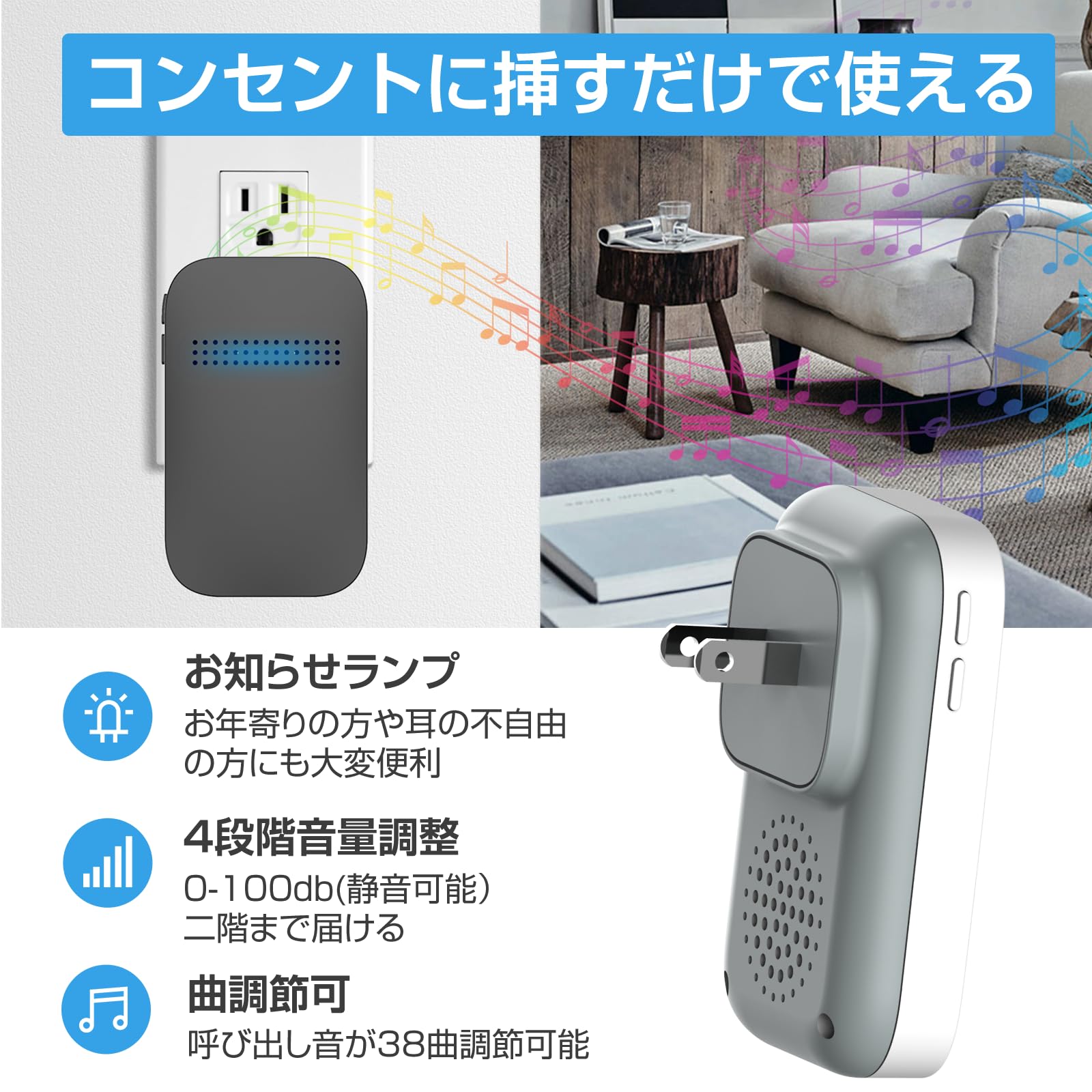 【38曲4段階音量調節可能のワイヤレスチャイム】このチャイムの発信機を押すと、受信機が音を立てながら青いライトが点滅してお知らせします。さらに38種類の曲と0-100DBの4段音量を調整することができます。使用したい場所やお好みに合わせてご使用ください。【電池不要&取付簡単】自動発電式の送信機は電池不要で、ボタンを押したときに電力を発生させて動作します。このため、電池式送信機のように電池交換の必要がなく、突然動かなくなったときの心配もありません。また、ネジと両面テープが付属しており、配線不要で簡単に取り付けることができます。【増設自由&送信機によって音色が違います】1台受信機は5台までの送信機を増設することができます。送信機も複数の受信機に対応することもできます。さらに、送信機ごとにメロディーを変更することができます。【IP54防水防塵仕様】この玄関チャイムの送信機はIP54防水防塵内部構造を採用しており、中に水が入ってもちゃんと動きます。玄関や屋外、浴室など非常に水濡れしやすい場所でも使用できます。メンテナンスや交換頻度が低く、長時間使用するチャイムとしてとても信頼できます。【150M範囲&安定受信】このドアチャイムは高感度の受信機と送信機を使用して、壁を通して安定的に利用することができます。屋内での使用はもちろん、2階建てでの使用も可能です。 また、送信機は大きな音を出すので、耳が悪い人でもすぐに気づくことができます。来客時の玄関チャイム、介護や御店での連絡や呼び出しに様々な場所にご利用できとして大活躍です。【メーカーより1年間の保証】何か不備な点がある場合は、ご遠慮無くお問い合わせください。