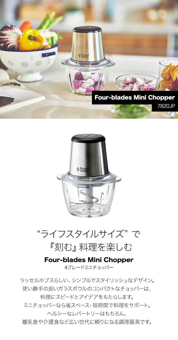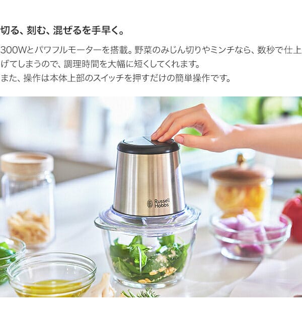 Russell Hobbsラッセルホブス 4ブレードミニチョッパー 7820JP “ライフスタイルサイズ” で『刻む』料理を楽しむ ラッセルホブスらしい、シンプルでスタイリッシュなデザイン。 使い勝手の良いガラスボウルのコンパクトなチョッパーは、料理にスピードとアイデアをもたらします。 ミニチョッパーなら省スペース・短時間で料理をサポート。 ヘルシーなレパートリーはもちろん、離乳食や介護食など広い世代に頼りになる調理器具です。 ライフスタイルに合わせて、使いたい食材や量を自由にお使い頂けます。 切る、刻む、混ぜるを手早く。 300Wとパワフルモーターを搭載。野菜のみじん切りやミンチなら、数秒で仕上げてしまうので、調理時間を大幅に短くしてくれます。 また、操作は本体上部のスイッチを押すだけの簡単操作です。 2段階のスピード調整 高速と低速の2段階スピード調整ができるので、肉や野菜などの食材をお好きなように調整可能です。 HIGH(高速):硬めの食材を粉砕する場合。 ●硬めの食材 / ミックスナッツ・肉のミンチ・ニンジン・ショウガなど。 LOW(低速):柔らかい食材を粉砕する場合。 ●柔らかめの食材 / フルーツ、玉ねぎ、卵、餃子の餡、ネギ、ニンニクなど。 基本レシピのほか、テーブルを鮮やかに飾るシンプルレシピ チョッパーをお買い上げの方には、肉や魚を使った基本ダネレシピのほかにも野菜メインのソースやスイーツのレシピなどテーブルをあざやかに彩るシンプルでヘルスコンシャスなレシピを提案します。 いろいろなコトがチョッパーでできる 刻む、混ぜるが手間なくスピーディに。 “5つのできるコト” [ミンチ] ハンバーグや餃子の種づくりがラク [ペースト] 裏ごしいらずで、ムラなくなめらか [すり身] えびや魚の繊維を残す [刻む] 野菜や果物のみじん切りも早い! [混ぜる] バジルソースなどのフレッシュなソース クリームディスクで簡単ホイップ 付属のクリームディスクに取り換えれば、生クリームも簡単にホイップできるのでお菓子作りにも役立ちます。 安全カバー付き2層4枚刃のカッターとクリームディスクの付属品 カッター刃は錆びにくいステンレス製素材を採用し、お手入れも簡単。保護カバーが付いているので、取り外しもケガの心配がありません。 また、クリームディスクに取り換えれば生クリームも簡単にホイップできるのでお菓子作りにも役立ちます。 軽くてコンパクト せっかくの調理器具も重くて大きいのでは、一度しまいこむと出してくるのが面倒になり、結局使わなくなりがちです。コンパクトなチョッパーなら、すぐに取り出せるようにしておけるので、気軽に使うことができます。コンパクトながらも容量は500mlと、使い勝手が良いサイズです。 衛生的に保てるガラスボウル ボウルはガラス製なので、長く使い続けても傷や匂いがつきにくいです。また、ガラスは油汚れを落としやすいので、肉や魚のミンチを作ったときの油のヌメリ感をさっと洗い落とすことができます。 電源 100V 50/60Hz 消費電力 300W サイズ W18.5×D15.5×H22.0cm 重量 1.7kg コードの長さ 1.7m 材質 ガラス、ステンレス、AS樹脂、ポリプロピレン 付属品 クリームディスク 最大内容量 500ml 定格時間 30秒 回転数(分) 約3,000〜4,500回転 生産国 中国 広告文責 株式会社ルーマニア/03-5876-8107 【ブランド:ラッセルホブス】