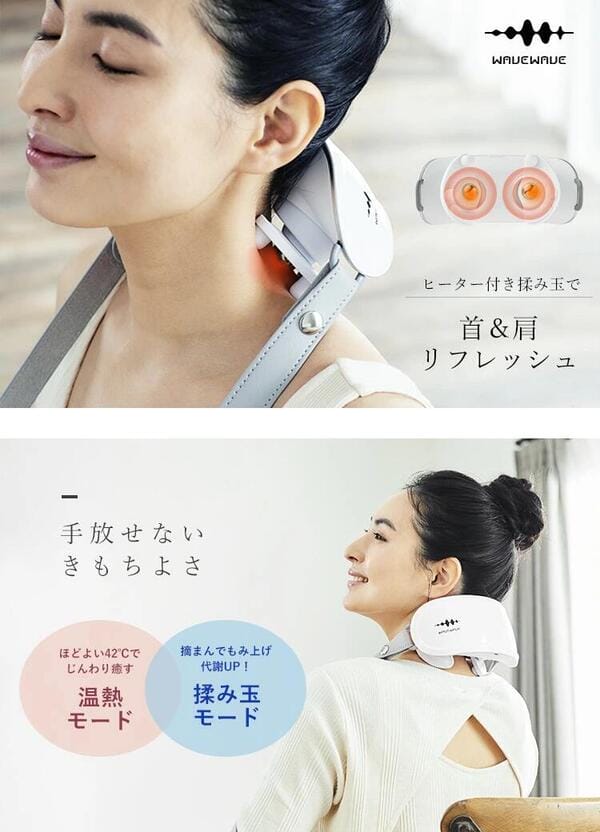 WAVEWAVE Neck Refresh ヒートネックリフレッシュ 手放せない きもちよさ 温めながら、もみほぐす ほどよい42度で じんわり癒す「温熱モード」 & 摘まんでもみ上げ 代謝UP!「揉み玉モード」 point1 手技を真似た「3D揉み玉」。 頸椎部位をつまみあげる、絶妙な動き! point2 温熱モードですばやく温め、自然にストレッチ point 3 腕、首、足など…、さまざまな体の部位に使えるマルチな機能 【温活 軽量 小型 肩 首 腰 揉み ネック リラックス 首掛け リラクゼーション 健康 癒し 温め 解消グッズ 健康グッズ 首こり ギフト プレゼント もみ玉 EMSなし】 商品名 WAVEWAVE Neck Refresh ヒートネックリフレッシュ サイズ 長さ190×幅95×高さ82mm 重さ 約500g 素材 ABS、アルミニウム、シリカゲル、PU 充電時間 約3.5時間 連続使用時間 約1.5時間 製造国 Designed in Japan. Made in China. 発売元 有限会社セブンウェイブ 広告文責 株式会社ルーマニア/03-5876-8107