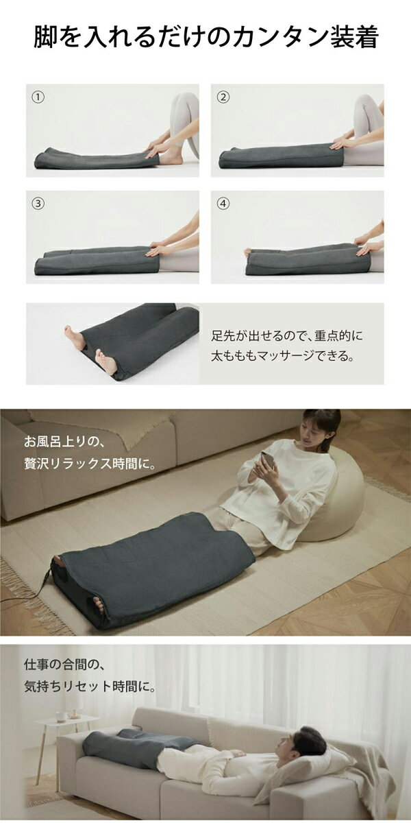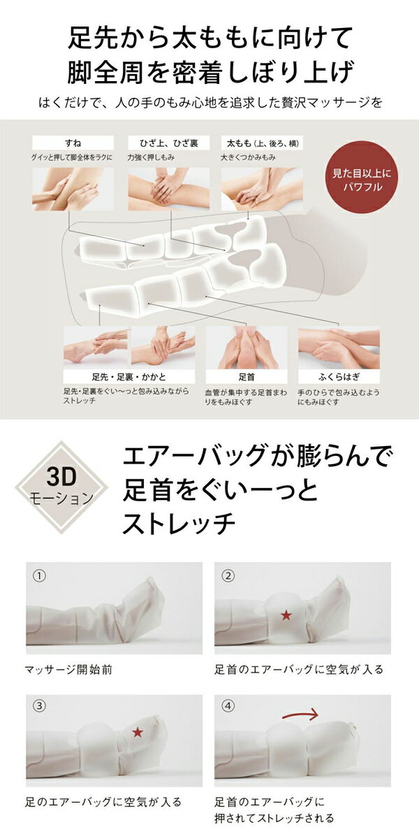 パナソニック エアーマッサージャー はくだけキュッとリフレEW-RA192-H ダークグレー いつものケアを、贅沢に。別格マッサージ。 ●脚を入れるだけ。おまかせAI制御の贅沢マッサージ。 (※脚のサイズによって、狙いの圧力に到達しない場合がありますが、異常ではありません。※) ●脚を入れるだけで、足先から太ももに向けて密着しぼり上げ。 ●脚の太さをAIで検知して、エアーバッグでぐるっと包み込む。家にいながら、プロの手技に 学んだマッサージを。 (※脚のサイズによって、狙いの圧力に到達しない場合がありますが、異常ではありません。※) ●はくだけで、脚の太さに合わせてプロに学んだ圧力と時間でAI制御。 (※脚のサイズによって、狙いの圧力に到達しない場合がありますが、異常ではありません。※) ●従来比150%のエアーバッグ面積で足先から太ももに向け密着しぼり上げ。 (※当社従来品2021年発売EW-RA190との比較にて、エアーバック面積 RA190 : RA192=4、002 cm2:6、066 cm2(当社調べ)※) ●コンパクトに三つ折りできるファブリックデザイン。 商品名 パナソニックエアーマッサージャー はくだけキュッとリフレEW-RA192-H ダークグレー サイズ 約幅600×奥行800×高さ60mm 重量 約2.1kg(ACアダプター除く) 製品仕様 電源コードの長さ:180cm 使用電源:電源AC100V/50-60Hz 定格消費電力:24W 類別:機械器具77バイブレーター 一般的名称:家庭用エアマッサージ器 医療機器の種類:管理医療機器 エアー圧力:強さレベル1:約12kPa、レベル2:約16kPa、レベル3:約21kPa、レベル4:約26kPa、レベル5:約31kPa(コースや部位によって若干の違いがあります) 施術箇所:足先、足裏、かかと、足首、すね、ふくらはぎ、ひざ裏、ひざ上、太もも前、太もも後ろ、太もも横 自動コース:しぼり上げ、ながしもみ、もみほぐし、ストレッチ タイマー:約10分 使用可能サイズ:足サイズ:約20cm〜28 cm、ふくらはぎ周囲:約31cm〜約48cm、太もも周囲:約39cm〜約58cm 付属品名称:ACアダプター 販売元 パナソニック株式会社 広告文責 株式会社ルーマニア/03-5876-8107