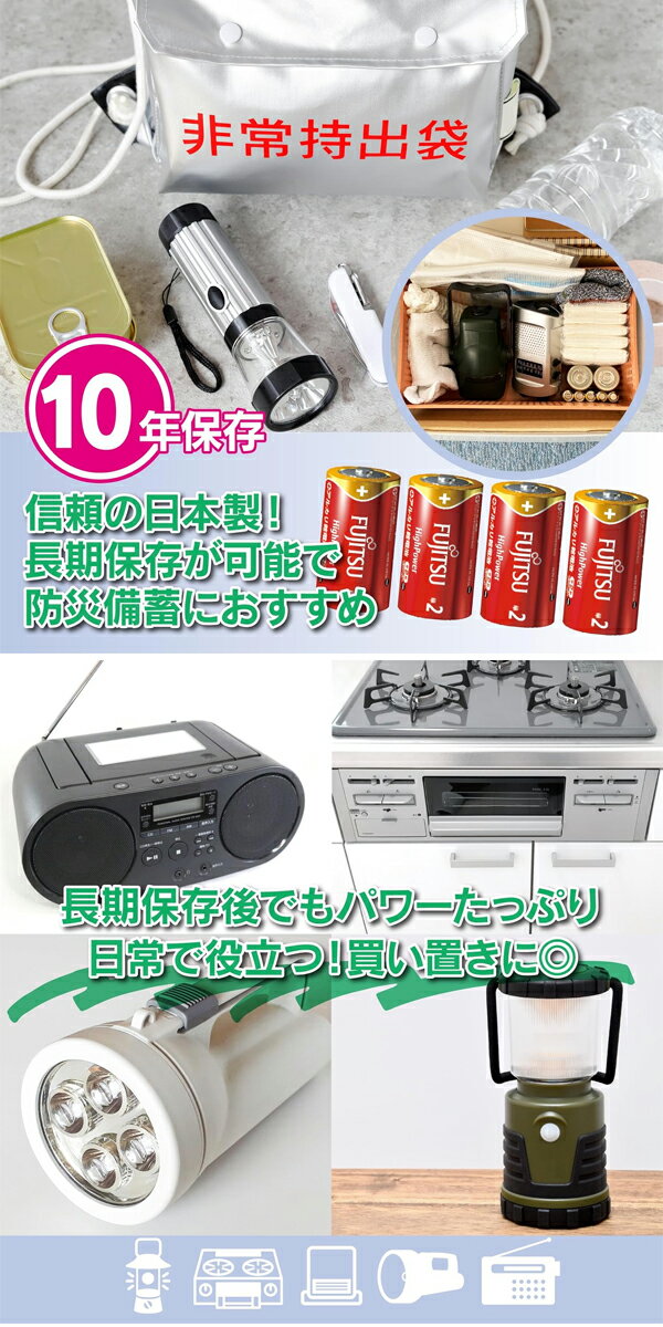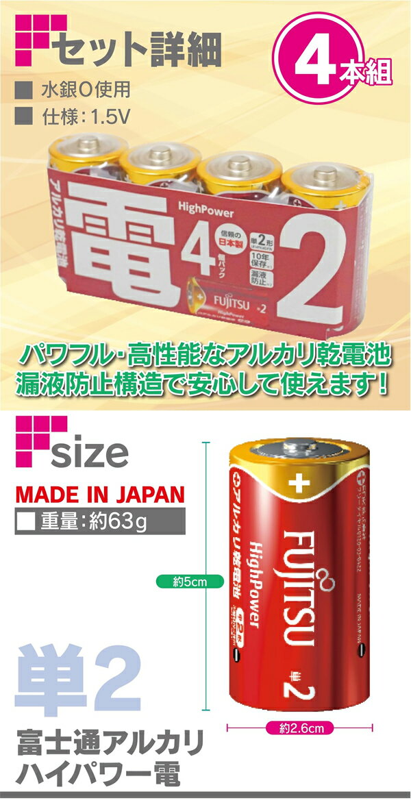 富士通 アルカリハイパワー電 単2形 4個 LR14FH(4S)FIN 日本製のアルカリ乾電池 ◆パワフル!選ぶならやっぱり日本製二 ◆ワイドレンジ性能をさらに向上させた高性能アルカリ乾電池の単二形4本セット。 ◆納得の日本製のため日常の様々なシーンで安心してご使用いただけます。 ◆漏液防止構造の採用により、10年間の長期保存が可能に。 ◆いざという時にも安心してご活用いただけます。※未使用時の使用推奨期限JISに準拠 ◆独自のレアメタルコート採用により、電池内部のガス発生を抑制し漏液防止性能を さらに向上させました。 ◆長く持つから買い置きにおすすめ。 ◆いざという時に使えないと困る電化製品、防災用品用の電池は一緒にストック しておきましょう。 商品名 富士通アルカリハイパワー電 単2形 4個 LR14FH(4S)FIN 商品サイズ 1本:直径2.6×5cm 仕様 セット内容:単2形×4本 仕様:1.5V 生産国 日本 販売元 富士通株式会社 広告文責 株式会社ルーマニア/03-5876-8107