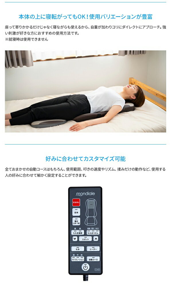 モンデール コンパクトマッサージシート 極上たたきCM3 頑張るあなたへ、心からのリラックスを。 ●まるで人の手で揉まれているような極上のマッサージを生み出すマッサージシート。 ●合計6個のもみ玉が「叩き」と「揉み」の2種類の動作を行い、疲れた身体を徹底的に マッサージ。 ●叩きのリズムは3種類から、叩きの速度は2段階から選択可能。揉みほぐしながら お好みのリズムや速度でコリを叩いてくれるので、ほどよい加減で癒やされたい方から しっかりほぐされたい方まで、幅広い好みに対応します。 ・使用バリエーションが豊富 ・好みに合わせてカスタマイズ可能 ・本格シート型なのに軽量コンパクト ・使いやすさを追求した細部へのこだわり ・インテリアに馴染む落ち着いたカラー 商品名 モンデールコンパクトマッサージシート 極上たたきCM3 サイズ 約幅45.7×奥行き114.3×厚さ17cm 重量 約4kg 材質 張地:表・PU、ポリエステル 裏・ポリエステル 座面裏:PVC、ポリエステル 仕様 耐荷重:約90kg セット内容:本体、ACアダプター、取扱説明書 表面最高温度:約40℃(ヒーター使用時) 医療機器認証番号:306AKBZX00020000 販売元 株式会社 ヴァルテックス 広告文責 株式会社ルーマニア/03-5876-8107