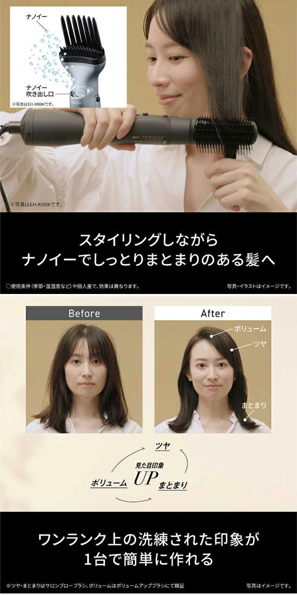 パナソニック エアスタイラー ナノケア EH-KN9K-H ノーブルグレー まとまる・ボリュームもこれ一つで簡単に。 ●うるおいで髪ケア。 ナノイーでうるおう髪へ。 ナノイーでしっとりまとまりのある髪へ。 ●髪の根元からボリュームアップ。 ブラシ1本1本から風が出て、髪の根元に風を届けやすいボリュームアップブラシで、 自然な印象へ。 ●美容室発想のサロンブローブラシでつややかにまとまる髪へ。 髪をはさむと、内側と外側の両方から温風でスタイリング。 毛先までしっかりとらえてまとまる髪へ。 商品名 パナソニックエアスタイラー ナノケア EH-KN9K-H ノーブルグレー サイズ 約高さ23.2×幅5.4×奥行7.0cm(アタッチメント・コード含まず) 重量 約380g(ボリュームアップブラシ取付時) 製品仕様 コード長さ:約1.7m 温風温度:約120℃(DRY/温風・室温30 ℃の時) BLDCモーター搭載(次世代ドライヤー):BLDCモーター非搭載 消費電力:650W 使用可能電圧:AC100V 付属品:サロンブローブラシ、ボリュームアップブラシ、ワイドブローブラシ、太ロールブラシ、ノズル 仕様1:ナノイー 仕様2:5種類のアタッチメント 仕様3:イオンチャージ、風温切替SET/DRY、クールショット(冷風スイッチ) 販売元 パナソニック株式会社 広告文責 株式会社ルーマニア/03-5876-8107