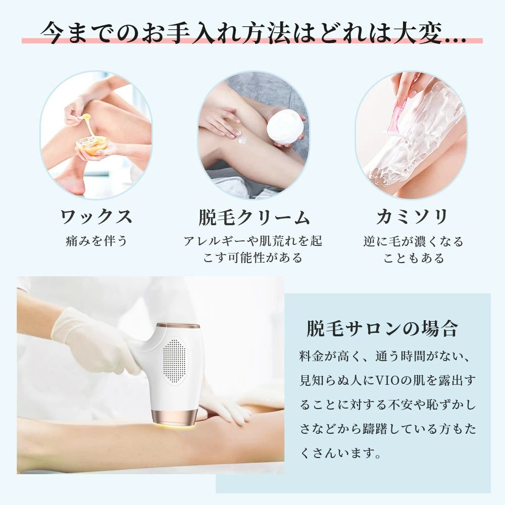 【光脱毛器】家庭用光美容器はサロン級の光技術を採用しており、光電原理ので安心なフラッシュパワーで効率的に奥まで届けます。【99万フラッシュ回数】99万回照射回数、耐久性が優れている、ランプ交換の必要もない。一目で残りのフラッシュ回数がはっきりわかります。ご家族と共用でき、高価なサロンエステ費用を節約でき、もっと経済的。【5段階調節・モード切替可能】脱毛器には5段階のエネルギーモードがあります。初心者は1段階から使うことをお勧めします。手動と自動2種類のモードが備えています。部位によって、エネルギーも変わります。ムダ毛ケア効率がアップ!個人状況に合わせて、ご自由にモード選択できます。広い範囲だけでなく、脇、口元、指など狭いのにも満足できます。【パッケージ内容】脱毛器本体*1、電源コード *1、サングラス*1、シェーバー*1、日本語取扱説明書*1。●ご注意:個人的の肌質や使用部位によって、ムダ毛ケア効果と美顔効果が異なります。【1年安心保証】お買い上日より12ヶ月の保証期間が付いており、万が一不具合があった場合、こちらとご連絡をお願いいたします。**注意事項**下記の状況は本製品を使用しないでください。●皮膚感覚の弱い方●アトピー性皮膚炎、皮膚損傷、開放性傷口のある方●光線過敏の方●化粧品、服装や金属などに過敏しやすい方●妊娠中・授乳中・生理中の方●過去2週間に過度な日焼けした方●15歳未満の方はご使用いただけません。関連キーワード:(本商品の説明ではございません)脱毛器 IPL脱毛 光美容器 全身 VIO 美肌 家庭用 レディース ムダ毛処理 髭 除毛 アンダーヘア サロン級 自動照射 効果 フェイス ヒゲ 脇 腕 指 メンズ 男女兼用 口コミ 自宅 プレゼント おすすめ お祝い 脱毛機 痛くない 安心1年保証 顔 家庭 脱毛器 光美容器 HIPL 全身 冷感 IPL vio対応 ムダ毛 ヒゲ 男女兼用 家庭用 レディース フラッシュ 美肌 ワキ 連射 ボディ サロン級 口コミ 自宅 家庭 無痛 脱毛機 痛くない 自動照射 5段階レベル お手入れ フラッシュ 安心1年保証 痛くない脱毛器 冷感 無痛 美容 母の日 プレゼント 成人の日 成人式 バレンタイン バレンタインデー ホワイトデー 還暦祝い お祝い 合格 ギフト プレゼント 卒業式 入学式 クリスマス 誕生日 2024 おすすめメーカー希望小売価格はメーカーサイトに基づいて掲載していますメーカー希望小売価格はメーカーサイトに基づいて掲載しています