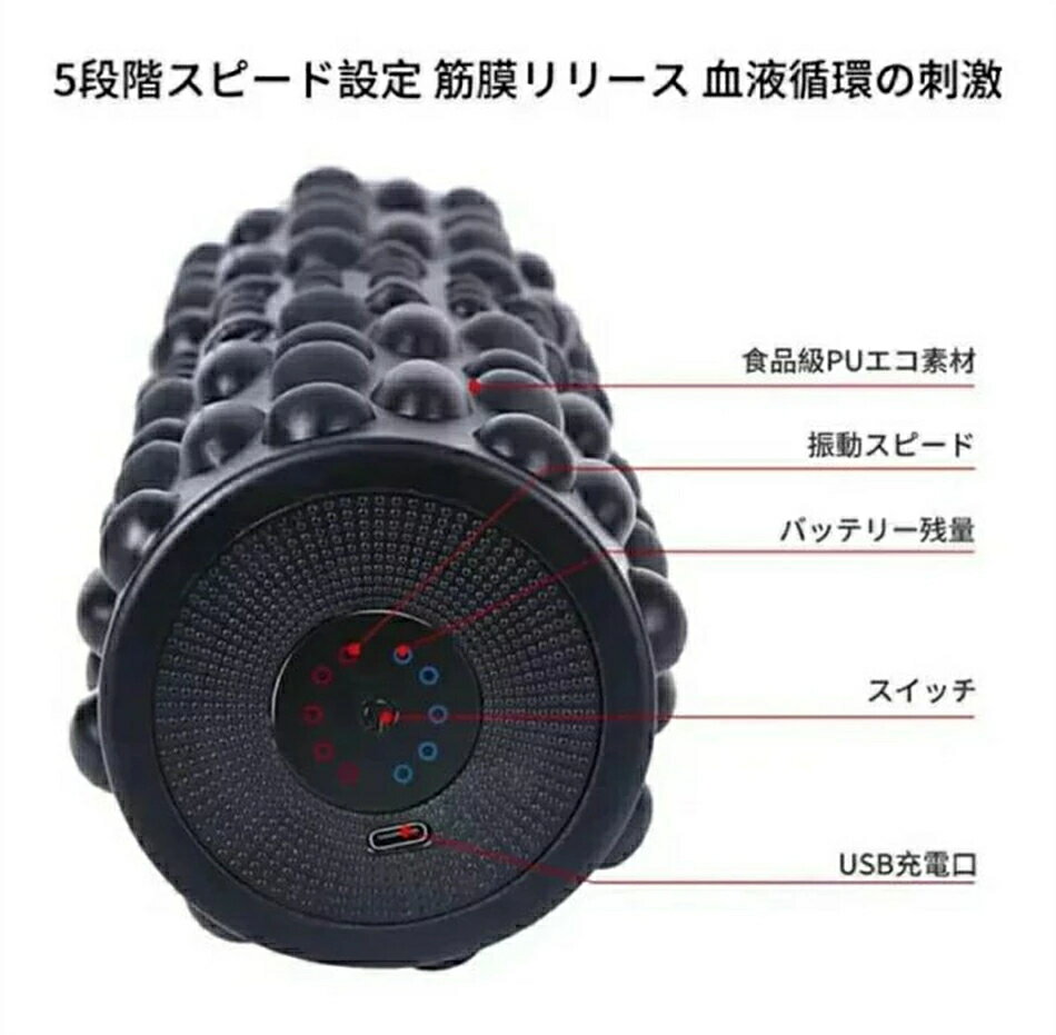 商品仕様 商品名:電動 マッサージロール 材質:食品級PUエコ素材+ABS サイズ:31.5*8.5cm 重さ:約1000g 充電式:USB充電 バッテリー容量:2000mAh 電圧/電流:5V/2A 充電時間:2時間 ★振動の強さも弱から強まで5段階に調整可能 ■レベル1:3000回/分 ■レベル2:3400回/分 ■レベル3:3800回/分 ■レベル4:4200回/分 ■レベル5: 5000回/分 セット内容:本体1式 、USB充電ケーブル1式、説明書1冊 使用方法: 〓長押すと起動します。 〓早押すと振動段階を切り替えます。 〓10分間で自動停止する設計の為、自動停止後、再度長押すと再起動します。 【1本2役&簡単使え電動フォームローラー】 電動マッサージは一般的な特色を持ちながら、電動フォームローラーの魅力が圧倒的です。電源をoffにしているとき、普通のフォームローラーと同じで、一本二役が実現!ですが、電動の方がもっと使いやすいです。スイッチで簡単調節すると、お好みでパターンを調節できます。ほんとにマッサージを楽しめます。フィットネス初心者にも、お年上の方にも簡単使えます。とくにフィットネス指導者、スポーツマン、フィットネス達人、スポーツ達人、オフィスサラリーマン、主婦などで大人気があります。 【5段階調節可&周波数調節可のストレッチロール】 スピードの調節がローモードからハイモードまで5段階と設計されました。強度マッサージも適用、柔らかいマッサージをも提供して、体の場合によって、深度マッサージか一般的なマッサージをするか、マルチ選択をご提供できます。とくに、フィットネス初心者に対して、フィットネス用製品にあんまり感じがないかもしれませんで、最初にローモードから体が振動感を慣れれば、ジョジョに強いモードを使えます。