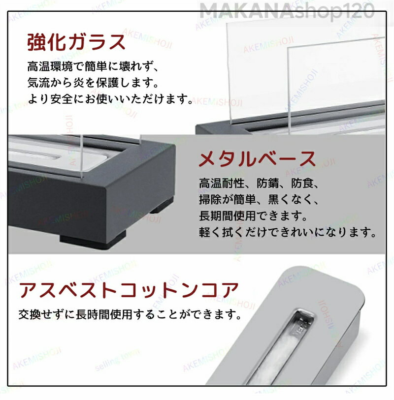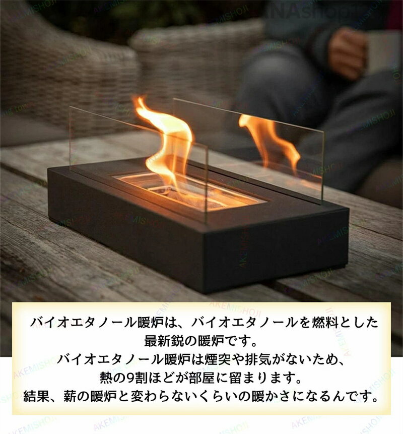 商品詳細 材質 材質 :ステンレス+耐熱ガラス サイズ 本体サイズ:35*18*15cm 重量 重量 :約1.75kg 内容 パッケージ内容 :本体、強化ガラス2枚、バーナー、消火フタ 特徴 特徴: ◎揺らめく炎に癒される:美しく暖かな炎を身近で楽しむ。バイオエタノール暖炉の炎は、部屋を暖めるだけのものではありません。バイオエタノールの燃焼によって灯るオレンジ色の美しい炎は観賞用としても大変優れています。暖かな炎は、人にリラックス効果や癒し効果を与えると言われています。 ◎置く場所を選ばない:コンパクトサイズで、場所を選ばないテーブルトップタイプのバイオエタノール燃料暖炉です。屋内でも屋外でも、ディナーやパーティーのテーブルに置いてご使用下さい。 ◎使いやすい &無煙、無臭、クリーン燃焼:簡単で経済的、電気、ガス、煙突は必要ありません。見つけやすく手頃な価格のバイオエタノール燃料を使用するだけで済みます。簡単セッティングで箱から出してすぐに使用できます。煙、すす、灰を気にする事なくリアルな炎をお楽しみ頂けます。フロントガラスパネルは炎が吹き飛ばされないことを保証し、また周りの人々の安全を保証します。 注意事項 *燃えている炎に燃料を入れないでください。 *冷却前に発熱した部分に触れないでください。 *燃料タンクが冷却された後に燃料を注ぎ込むことができます。 ★商品は簡易包装でお送り致します。 ▼お使いのモニターによっては、実際の色と若干異なって見える場合があります。 ★ 製造時期によりデザインや仕様に若干の変更がある場合がございます。ご了承ください。 ▼実寸は素人採寸ですので、多少の誤差はご了承願います。 ▼この商品は当店実店舗でも販売しております。在庫数の更新は随時行っておりますが、 お買い上げいただいた商品が、品切れになってしまうこともございます。 その場合、お客様には必ず連絡をいたしますが、万が一入荷予定がない場合は、 キャンセルさせていただく場合もございますことをあらかじめご了承ください。