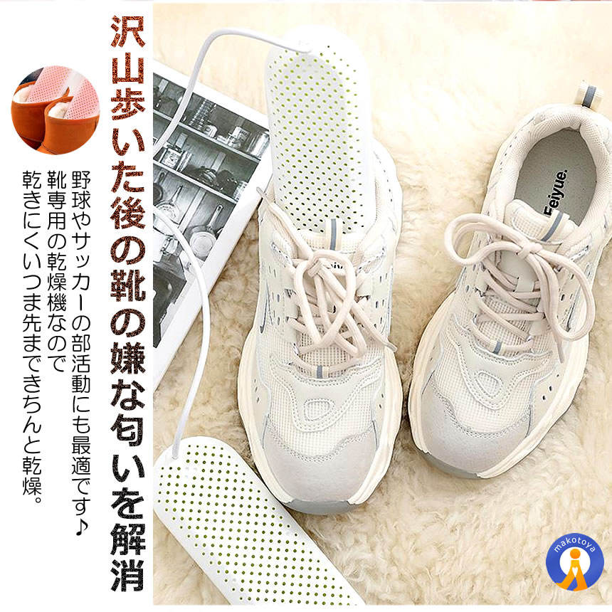 梅雨時や雪の多い地域で大活躍! 野球やサッカーの部活動にも最適です♪ 靴専用の乾燥機なので、乾きにくいつま先まできちんと乾燥。 カビやニオイを防ぎます。 一台三役靴乾燥機消臭&除菌&乾燥! 一台くつ乾燥機で三つ役割で、雪、雨の日、運動後靴、梅雨などで ニオイの原因である大量の雑菌と湿気をオゾンで除去し 180°発熱設計で、靴が全体的に平均に乾燥する同時に 脱臭と除菌なども行なえます。 タイマー付き便利性がアップ 3H、6H、9H三つのモードより、ご用途に合わせて自由に設定できます USB式で省エネルギー USB給電ので、モバイルバッテリー等にも対応でき どんな場合でも乾燥できます。 ■商品サイズ(cm):幅約18.0x奥行約6.3x高さ約2.6 ※最大温度(約55度まで)時間がかかります。 最大温度に設定する際は9Hモードをご利用下さい。 ※北海道は+300円UP、離島及び沖縄県は+400円UPにて承ります。