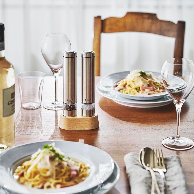 テーブルトップもスマートに。テーブルコーディネートや料理の味わいにプラスもできる、ハンディサイズの電動ミル。◇ダイニングテーブルの便利アイテムハンディサイズでコンパクトなため、スペースをとりません。料理の最後の仕上げにも、食事中の一足しにも便利なアイテムです。シルバーのステンレス質感は清潔感ある印象を与えてくれ、ブラックはテーブルにあるだけで、家庭の食卓がカフェのように、こなれたオシャレ感が演出できます。◇片手でワンプッシュミル上部のボタンを押すと、電動で挽くことができます。片手で操作できるサイズ感で、食材を混ぜたり炒めたりする手を休めずに使用することができます。◇残量が見やすい透明なキャビンキャビンに入る容量が従来よりも25%アップしました。(※)キャビン部は透明なので、残量が一目で分かります。また、広めの充填口により、塩や胡椒を楽に上手に入れることができます。※当社調べ。内容物によって多少の充填量が変わります。◇汚れを防ぐ専用スタンドグラインダー部に残る細かな胡椒や塩がテーブルなどに飛散しないよう、専用スタンドが付いています。ミルの転倒防止にもなります。◇岩塩にも使えるセラミック刃錆の心配がなく、岩塩にも使用できる丈夫なセラミック製の刃を採用。また、摩擦熱が生じにくいため、熱で飛びやすい胡椒の香りを保ちます。◇好みの挽き方が可能粗いものから細かいものまで、好みに合わせた挽き方を自在に調節することができます。◇底部のツマミで挽き加減を調整本体底にあるツマミ部分には、細い矢印と、太い矢印のマークが記されています。ツマミを細い矢印方向に回転すると細挽きに、太い矢印方向に回転すると粗挽きになります。●商品サイズ(cm)本体:幅約3.5×奥行約3.5×高さ約18.5スタンドセット:幅約10.5×奥行約5.5×高さ約19.5●商品重量本体:約200gスタンドセット:約450g●材質ステンレス、セラミック、PCTG樹脂、ABS樹脂●電源1.5V アルカリ単4乾電池4本(別売)※充電池は使えません。●付属品スタンド●カラーシルバーブラック (検索用:ラッセルホブス russell hobbs ミル イギリス おしゃれ かっこいい 新生活 ギフト 贈り物 4560132470608 4560132470592) 関連キーワード(本商品の説明ではありません)母の日 父の日 敬老の日 こどもの日 クリスマス バレンタイン ホワイトデー ハロウィン お正月 成人の日 成人式 記念日 誕生日 卒業式 入学式 お歳暮 お中元 春 夏 秋 冬 梅雨 節分 ひな祭り 七夕 十五夜 初詣 年越し 夏祭り 花火大会 結婚祝い 内祝い 出産祝い 快気祝い 還暦祝い 古希 喜寿 傘寿 米寿 卒寿 白寿 百寿 新築祝い 引っ越し祝い 開店祝い 開業祝い 就職祝い 昇進祝い 合格祝い 銀婚式 金婚式 七五三 長寿祝い 御礼 お母さん お父さん 義母 義父 祖父 祖母 おばあちゃん おじいちゃん 娘 息子 彼氏 彼女 恋人 友達 上司 先輩 後輩 同僚 キッズ 子供 幼児 ベビー 赤ちゃん 育児 学生 社会人 シニア 10代 20代 30代 40代 50代 60代 70代 80代 90代 一人暮らし 単身赴任 主婦 主夫 新生活 家族暮らし 子育て 旅行 トラベル ライブ ホームパーティ ビジネス 法人 ギフト プレゼント 最強翌日配送対象商品に関するご案内 最強翌日配送対象商品・対象地域に該当する場合は最強翌日配送マークがご注文カゴ近くに表示されます。 最強翌日配送可能なお支払方法は【クレジットカード、代金引換、全額ポイント支払い】のみとなります。 下記の場合は最強翌日配送対象外となります。 ・15点以上ご購入いただいた場合 ・時間指定がある場合 ・ご注文時備考欄にご記入がある場合 ・決済処理にお時間を頂戴する場合 ・郵便番号や住所に誤りがある場合 ・最強翌日配送対象外の商品とご一緒にご注文いただいた場合 ・お届け先住所文字数が40文字以上の場合 様々な商品を取り扱っております - こんなイベント / 行事に - ギフト プレゼント 贈り物 お返し 祝い 出産準備 出産祝い 誕生日 誕生祝い ハーフバースデー 入園 入園式 入学 入学式 卒園 卒園式 卒業 卒業式 新学期 - 誰へ - 男の子 女の子 赤ちゃん ベビー 子供 子ども こども 娘 息子 孫 甥っ子 姪っ子 小学生 中学生 高校生 大学生 社会人 友達 友人 親戚 兄弟 姉妹 ママ友 妻 旦那 夫お届け先が沖縄・離島の場合、お届け日時のご希望に沿えない場合がございます。予めご了承ください。