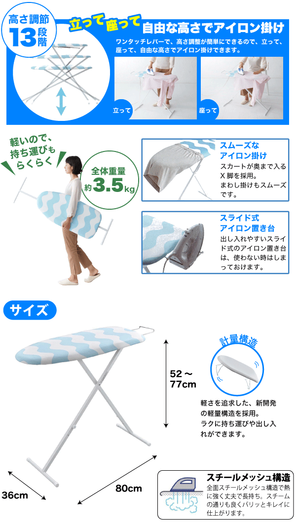 商品情報 簡単高さ調節で、立っても座ってもアイロン掛け! 13段階の高さ調整で、立っても、座ってもアイロン掛けができます!ワンタッチレバーでの簡単操作なので、だれでも簡単に高さ調整可能です。Xタイプの脚なので、スカートなども奥まで入れられ、まわし掛けだってラクラク! ●立った状態や座った状態など、やりやすい位置でアイロン掛けできます ●ワンタッチレバーの簡単操作で、13段階調節可能 ●X型の脚なので、スカートなども奥まで入る! ●まわし掛けもスムーズです ●スライド式のアイロン置き台で、使わない時には邪魔になりません ●軽いので、持ち運びもラクラク! ●熱に強く丈夫で長持ちスチールメッシュ構造 ●スチームの通りがよく、パリッとキレイに仕上がります♪ サイズ(約) 使用時/W80×D36×H52〜77cm 収納時/W118.5×D36×H6cm 重量/3.5kg 材質 表面布/ポリエステル・綿 天板/スチール(粉体塗装) 脚部/スチール(粉体塗装) 置き台/スチール(ユニクロメッキ) キャップ/ポリエチレン クッション材/ポリエステル 配送区分 備考 こんな方におすすめ スタンド式 高さ調節 高さ調整 直立 座って 座りながら 天板 アイロン台 アイロン アイロン掛け スチーム スチールメッシュ 軽量 軽い 通気性 スカート掛け 掛けやすい スラックス スカート シャツ ワイシャツ 袖口 衣類 服 かけやすい 山崎実業 ヤマザキ 新生活 応援 入学 RORETS より人気? 便利 YAMAZAKI 07809 使いやすい 徳用 通販 オススメ として メーカー希望小売価格はメーカーカタログに基づいて掲載していますウェーブ柄タイプ(本ページ) アルミコーティングタイプはこちら