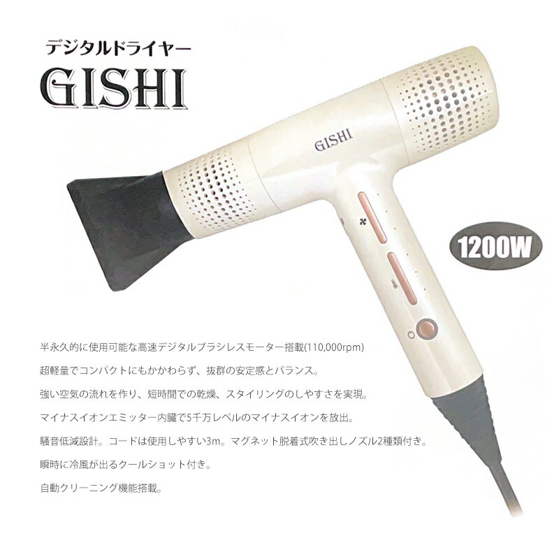 デジタルドライヤー GISHI 1200W ブラシレスモーター ヘアードライヤー 軽量 コンパクト 速乾 マイナスイオン 低騒音 静音設計 マグネット吹き出しノズル クールショット 自動クリーニング ヘアドライヤー ブラシレスドライヤー 大風量 低騒