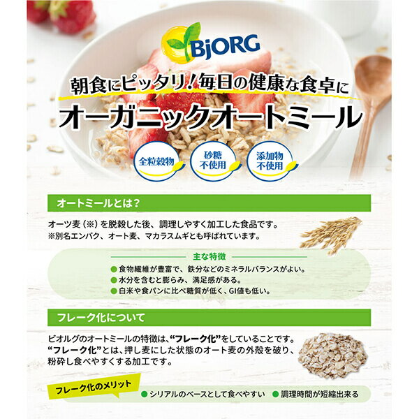 ビオルグ 有機オートミールは、有機栽培された100%オーツ麦を使用したオートミール。 素材そのままのほのかな甘みが特徴です。 乳や豆乳をかけて。 水を加えお好みの柔らかさに煮て、フルーツや甘味料を加えても美味しくお召し上がり頂けます。 また、パンやクッキー等の材料としてもお使い頂けます。 ヨーグルトやサラダのトッピングとして。 <ビオルグ> ビオルグは1988年にフランスで創立された、健康的で良質な商品を目指した栄養士が立ち上げたブランドです。 ヨーロッパのオーガニック商品として抜群の信用と知名度を持っています。 高品質な有機原料を使用した約200種類の商品を製造し、フランス国内の約7000店舗に卸しています。 また、ヨーロッパ全土のスーパーマーケットや自然食品店などで展開しています。 ■商品名:オートミール オーガニック オーツ ビオルグ 有機オートミール シリアル ダイエット クイックオーツ ■内容量:500g ×2個 ■原材料名:有機オーツ麦 ■輸入者或いは販売者:(株)ミトク ■賞味期限:14ヶ月 ■保存方法:直射日光・高温多湿を避けて保存してください。開封後は湿気を防ぐ為、密閉保存し、お早めにお召し上がり下さい。 ■区分:食品 有機JAS ■製造国:ドイツ【免責事項】 ※記載の賞味期限は製造日からの日数です。実際の期日についてはお問い合わせください。 ※自社サイトと在庫を共有しているためタイミングによっては欠品、お取り寄せ、キャンセルとなる場合がございます。 ※商品リニューアル等により、パッケージや商品内容がお届け商品と一部異なる場合がございます。 ※メール便はポスト投函です。代引きはご利用できません。厚み制限(3cm以下)があるため簡易包装となります。 外装ダメージについては免責とさせていただきます。
