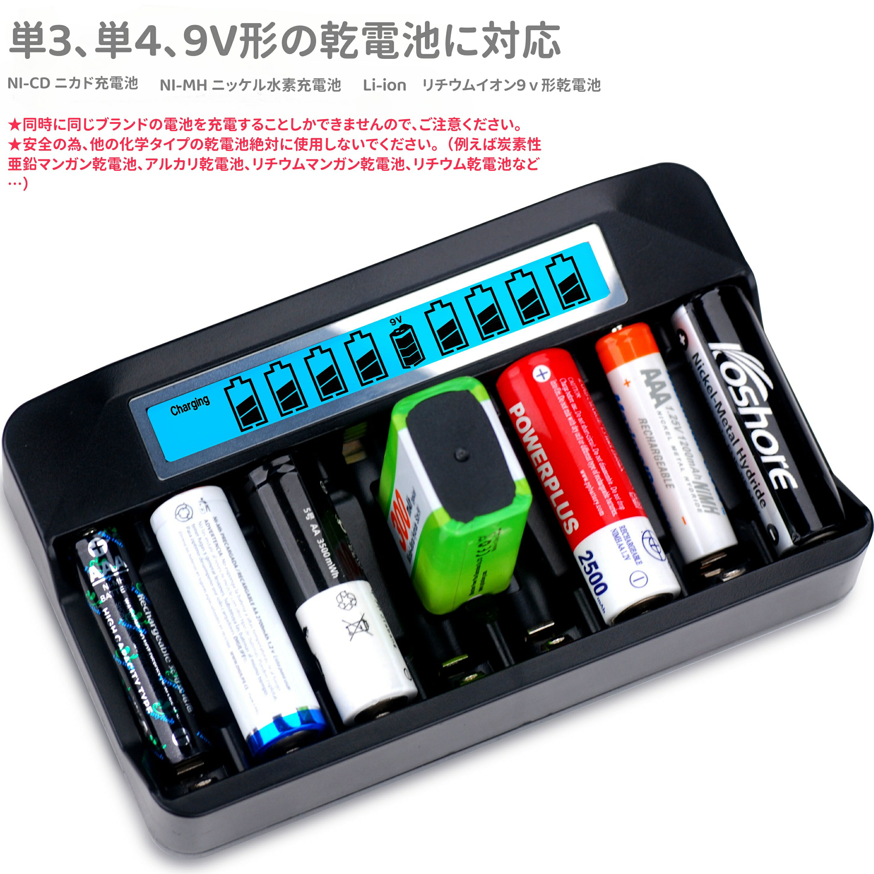 乾電池 充電器 電池充電器 マルチチャージャー ニッカド、ニッケル水素 リチウムイオン電池 単3、単4、9V充電池対応 LCD付きマルチ充電器 日本語説明書付