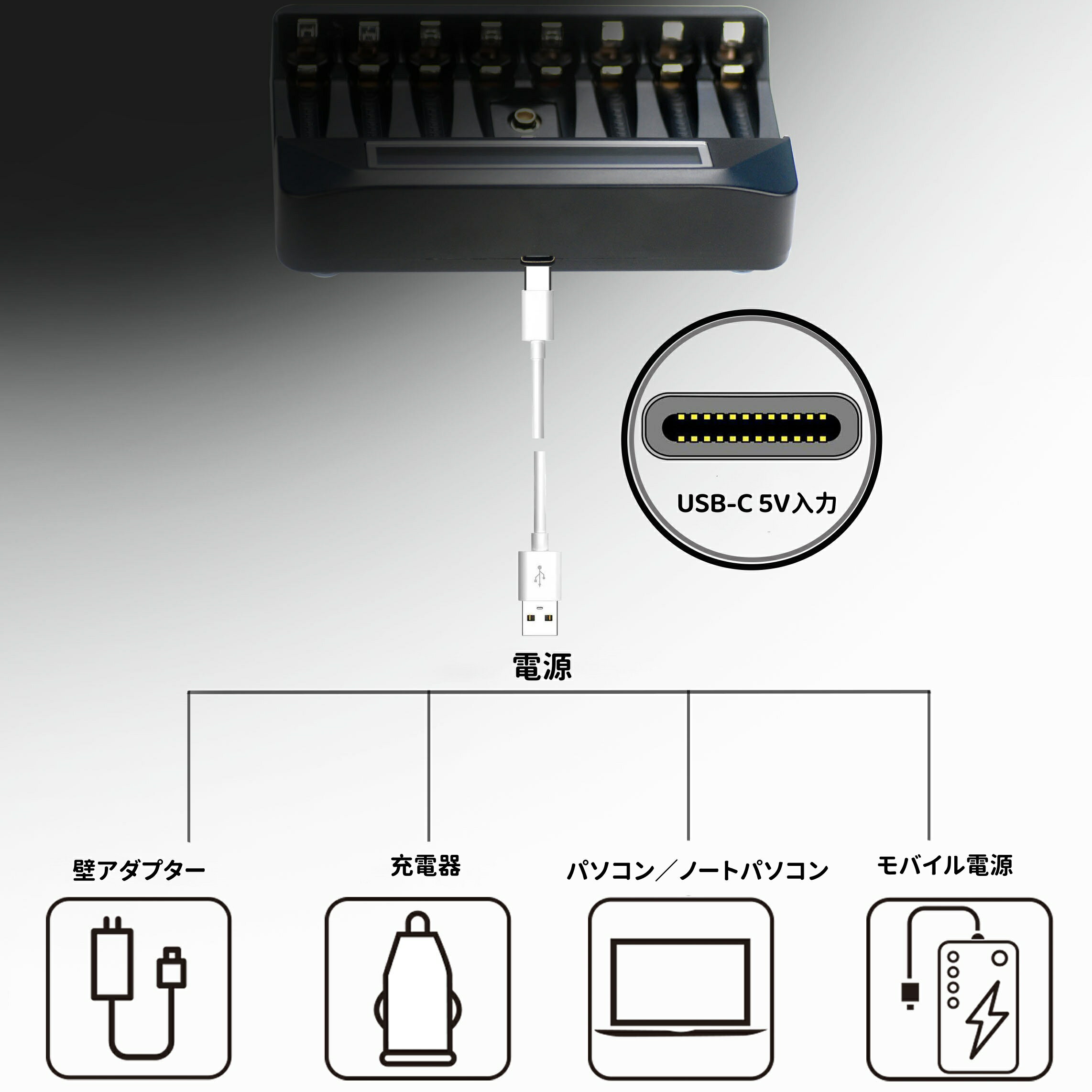 乾電池充電器は単3/単4/9V形の乾電池に適しています。乾電池化学タイプはニッケル水素/ニッケルカドミウム(標準電圧1.2V)の単乾電池で、9V形ブロック乾電池のみニッケル水素/ニッケルカドミウムに加え、新型の9V形ブロックリチウムイオン乾電池にも適しています。★充電器の破損や人、器物などの損傷を引き起こす可能性がありますので、炭素性亜鉛マンガン乾電池、アルカリ乾電池、リチウムマンガン乾電池、リチウム乾電池に使用しないでください。 マルチチャージャーはニッケル水素またはニッケルカドミウム乾電池単3/単4最大8個まで、またはニッケル水素またはニッケルカドミウム乾電池単3/単4最大6個まで、かつ9V形のニッケル水素/ニッケルカドミウムまたはリチウムイオン乾電池1個を追加できます。9スロット独立充電で、どの組み合わせでも同時充電が可能です。複数電源オプションに対応するUSB-C 5V 2A急速充電入力ポートを備え、長いお待ち時間を節約することができます。 乾電池充電器は高感度チップが乾電池の変化を正確に検知し、充電停止を検知すると、大電流充電からトリクル充電に移行することで、乾電池を保護して乾電池の寿命を延ばすことができます。乾電池不良を検知し、充電を止める機能があります。脈充電、迅速な電流を提供することができるのと乾電池の液漏れを防止し、さらに乾電池の自己放電を防止します。 乾電池充電器は科学的な人間工学に基づいたLCDディスプレイは、乾電池の充電状態を見やすくしています。各乾電池の充電状態が画面上から観察でき、充電状態が変化するとライトが点灯します。 【アフターサービス】30日内に万が一初期不良があった際は、返金または交換の対応をさせて頂きます。商品に関する問題はお手数おかけ致しますが、いつでもメールにてご連絡ください。サポート担当者が迅速に対応させていただきます。単3/単4/9V形、乾電池化学タイプはニッケル水素/ニッケルカドミウム(標準電圧1.2V)の単乾電池で、9V形ブロック乾電池のみニッケル水素/ニッケルカドミウムに加え、新型の9V形ブロックリチウムイオン乾電池にも適しています。