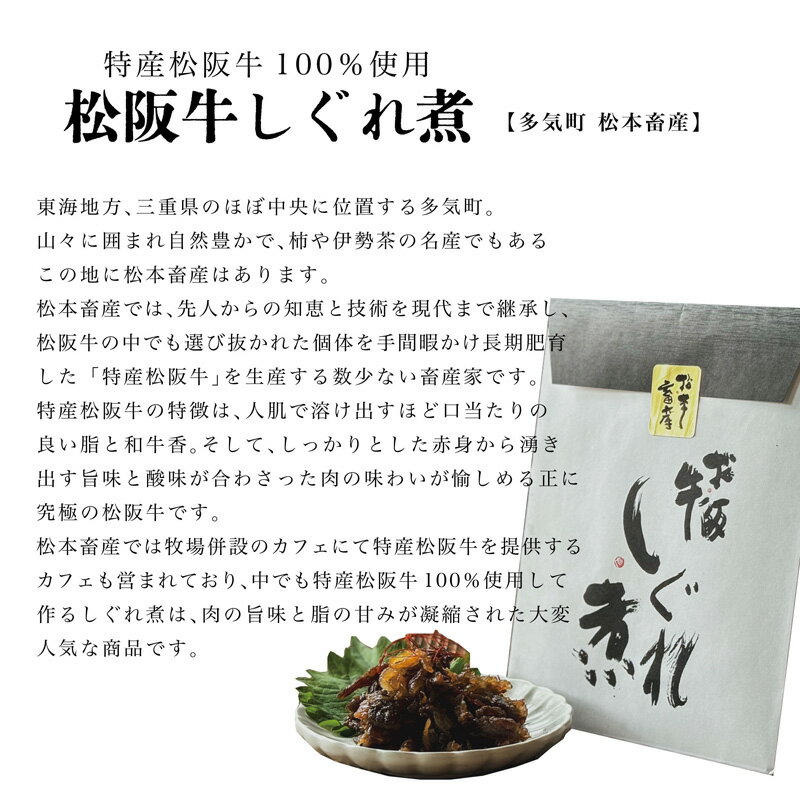 ------------------- 【内容】 ------------------- ・特産松阪牛 しぐれ煮×4袋 ■賞味期限:製造日から3ヶ月以内。 ■保存方法: 直射日光、高温多湿を避けて保存してください。 ※リサイクル箱を使用してお届け致しますのでギフト包装でのご対応は致しかねます。------------------- 【内容】 ------------------- ・特産松阪牛 しぐれ煮×4袋 ■賞味期限:製造日から3ヶ月以内。 ■保存方法: 直射日光、高温多湿を避けて保存してください。 普通の松阪牛の肥育期間は900日間(約2年半)が基準とされています。 それ以上の肥育期間を設けると、老年化により肉質が硬くなり、 また病気になる可能性もあるため、900日間が基準となっています。 松本畜産は、通常より1年と長い肥育期間を設けて、 卓越した肥育技術により特産松阪牛を育てています。 ------------------- 【お求め前に必ず御確認下さい】 ------------------- ・本商品は他の商品との同梱はお受け致しかねます。 ・複数点の商品をお求めの場合は個別に送料が必要となります。 (その場合、御注文確定時に送料を加算させて頂きます。) リサイクル箱を使用してお届け致しますのでギフト包装でのご対応は致しかねます。