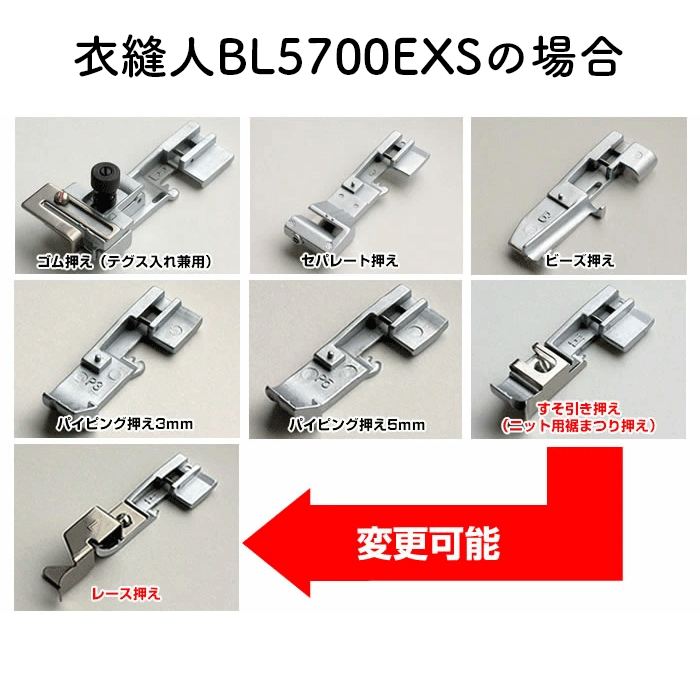 【セット内容】 すそ引き押え(ニット用裾まつり押え)、パイピング押え(3mm用と5mm用)、ビーズ押え、ゴム押え、セパレート押えの6種類 ※1本針3本糸の糸取物語・衣縫人では、「パイピング押え」「セパレート押え」は使用できません。 ※本セットに「レース押え」は含まれておりません。 当店人気のBL5700EXSには標準で「ニット用裾まつり押え」が付属しています。 そこでミシンジャパンでは、重複する「すそ引き押え(ニット用裾まつり押え)」を「レース押さえ」に変更してセット販売することも可能です! 衣縫人BL5700EXSをご使用の方でご希望の方はご注文時に「レース押さえに変更」と備考にご記入ください。■この商品を見た人はこちらも購入しています。 色を選べる!ポリエステル100% 商品名:ポリスパン1500m巻き