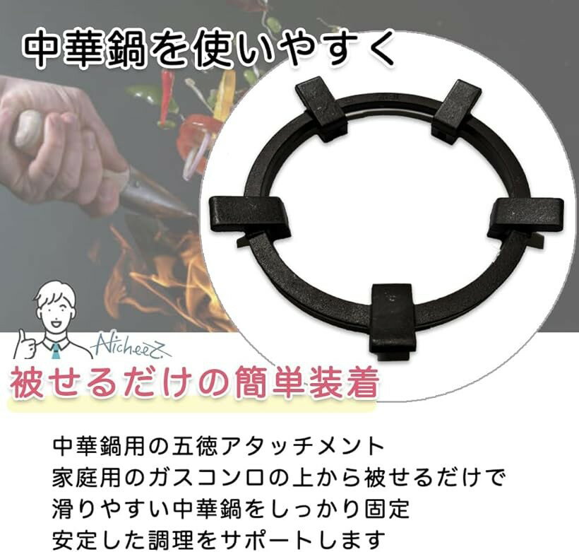 「中華鍋を使いやすく」中華鍋用の五徳アタッチメントです。家庭用のガスコンロの上から被せるだけで滑りやすい中華鍋をしっかり固定し安定した調理をサポートします。「実用性の高い鋳鉄製」頑丈な鋳鉄製で重量感があるのでナベがズレにくく料理もしやすい。 4脚と5脚どちらの五徳にも対応。一体構造の作りなので取り付け・取り外しもしやすく、丸洗いできるのでお手入れも簡単。「様々な調理器具にも」アタッチメントの爪部の形状は斜めになっているので、中華鍋のほかにも様々なサイズの平底鍋、丸底鍋、小さめのフライパンなどにもお使いいただけます。「商品内容」中華鍋用五徳アタッチメント 素材:鋳鉄 サイズ:外径/約212mm 内径/約161mm※ 他ネットショップでも併売しているため、ご注文後に在庫切れとなる場合があります。予めご了承ください。※ 品薄または希少等の理由により、参考価格よりも高い価格で販売されている場合があります。ご注文の際には必ず販売価格をご確認ください。※ 沖縄県、離島または一部地域の場合、別途送料の負担をお願いする場合があります。予めご了承ください。※ お使いのモニタにより写真の色が実際の商品の色と異なる場合や、イメージに差異が生じることがあります。予めご了承ください。※ 商品の詳細(カラー・数量・サイズ 等)については、ページ内の商品説明をご確認のうえ、ご注文ください。※ モバイル版・スマホ版ページでは、お使いの端末によっては一部の情報が表示されないことがあります。すべての記載情報をご確認するには、PC版ページをご覧ください。