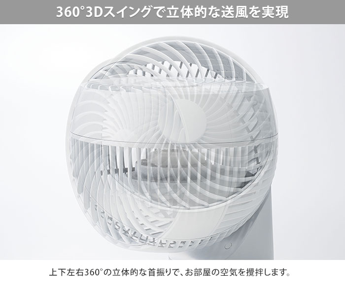 ●DCモーター+3Dスイングで風を自在にコントロール 上下左右360°の立体的な首振りでお部屋の隅々まで強力な風を届けるコンパクトサイズの多機能DCサーキュレーター。 すべての構造を徹底的に見直すことで、従来機種の風速をそのままに、これまでの大きさでは設置が難しかったカウンターや棚などの狭い場所でも設置しやすいサイズ感を実現しました。 ガードのパーツはすべて工具不要で分解して水洗いできるので、お手入れも簡単。 風量は10段階で設定でき、さらに部屋干しの乾燥時間を短縮できる衣類乾燥モードを搭載。 風量やタイマーが数字で表示されるので操作しやすく、設定が一目でわかるのもポイントです。 商品詳細 カラー ホワイト ブラック 型番 CFT2493BK CFT2493WH サイズ(約) 幅20×奥行17.5×高さ28cm 重量(約) 1.4kg 材質 ABS、PP 仕様 電源:AC100V 50/60Hz 消費電力:16W 電気代/1時間:約0.50円(16W連続運転時) ※単価31円/kWh(税込)で計算した際の目安となります。 モーター種類:DCモーター 風量設定:10段階(衣類乾燥含む) 自動首振り:3Dスイング360°、左右60° オフタイマー:1〜9時間(1時間単位) 機能:衣類乾燥モード、ディスプレイ表示、メモリー機能、減灯機能 適用畳数(目安):18畳 コード長:約1.5m 付属品:リモコン(CR2032電池内蔵) 保証期間:1年間 備考 ※リモコンの操作距離は直線で約5mです。 注意事項 ※商品の色はモニターの具合で実物と若干異なる場合がございます。予めご了承下さい。 ※デザイン、仕様等につきましては、予告なく変更する場合がございます。 関連ワード:DC TURBO CIRCULATOR 360/CF-T2493/CFT2493/白/ホワイト/黒/ブラック/THREEUP/スリーアップ/スリーアップサーキュレーター/サーキュレーター/DCモーター/360度首振り/首振り/自動/空気循環/循環/換気/扇風機/送風/送風機/衣類乾燥/洗濯物/部屋干し/室内干し/乾燥/リモコン付き/洗える/お手入れ/分解/スウィング/スイング/小型/コンパクト/エアコン/効率/冷房/暖房/冷暖房/静音/ターボ/風量調節/寝室/リビング/キッチン/ロフト/インテリア/デザイン家電/季節家電/誕生日/新居/引っ越し/贈り物/プレゼント/ギフト/父の日/母の日/敬老の日/クリスマス/バレンタイン/ホワイトデー/新築祝い/新生活/結婚祝い/出産祝い/引っ越し祝い/10代/20代/30代/40代/50代/60代/70代