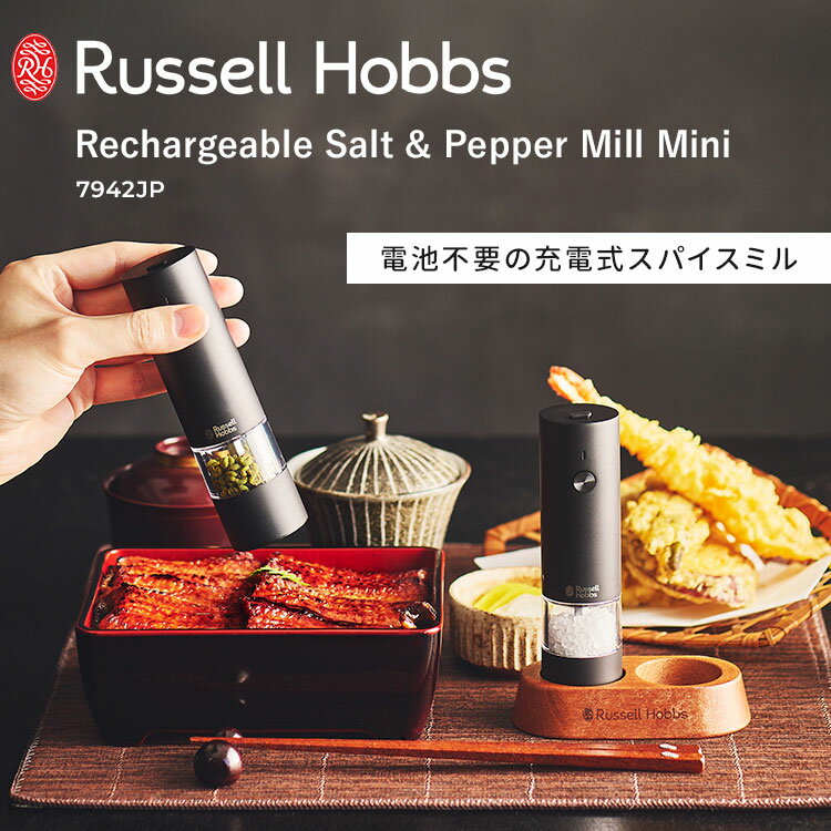 【300円クーポン】Russell Hobbs 充電式ミル ソルト&ペッパー ミニ(2本+ウッドスタンドセット) 7942JP ラッセルホブス ソルトミル ペッパーミル 電動ミル USB充電式 ワンプッシュ コンパクト 塩 胡椒 乾燥ハーブ スパイス 細挽き 粗挽き 【ポイント10倍】