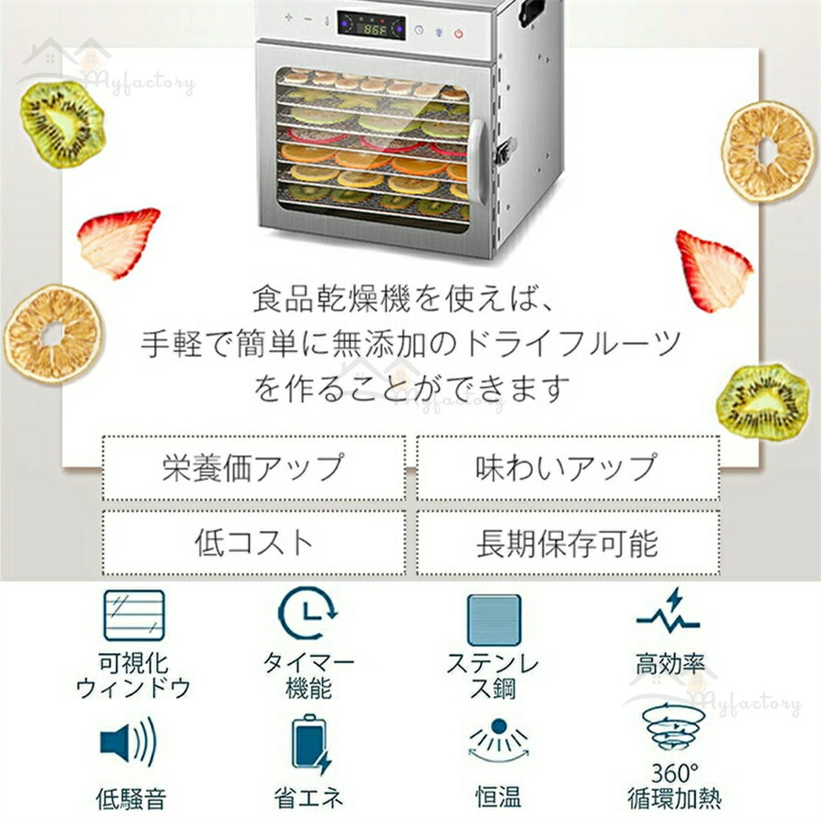 商品情報【高効率で省エネ】600Wの火力と、水平気流を提供する後ろ置きファンの組み合わせで、干し牛肉、干し魚などをより効率的な作成することができます。8つの可動式ステンレスメッシュと1つの水受けトレーを搭載し、異なる種類の食品を同時に乾燥させることができます。方形デザインは、市販の丸いフルーツドライヤーよりも大きな容量を提供しています。【簡単操作と低騒音】機械回転ボタンで温度・作業時間簡単に設定できます。温度調節30-90℃調節できます。タイマー12時間設定できます。手軽に乾燥野菜やドライフルーツを作れます。家族の健康だけでなく、愛犬の健康まで守れる嬉しい商品です。音仕様のモーターを採用し、作動音は約45-50dB、夜間運転でも静かです。【より均一な乾燥と360度熱風循環】弊社のフルーツドライヤーはプラスチック制フルーツドライヤーと異なり、ファンは底面ではなく背面に配置されているため、各層の食材はより均等に乾燥されます。背面ファン1個付き、360度循環の熱風で全トレイをしっかり加熱します。【洗浄簡単&優れた耐久性】このフルーツドライヤーは304ステンレス鋼で作られております。日常的に使用することでは、湿った布で簡単に本体を拭き取れます。ステンレス製のメッシュとトレーは手洗いが可能で、食器洗い機でも洗浄できます。プラスチック製フルーツドライヤーに比べて、ステンレス製の方が洗浄しやすいだけでなく、寿命も長いです。【様々な食材の乾燥に】30-90℃の低温・高温乾燥に対応しています。干し野菜やドライフルーツ、ジャーキー、干し芋、ペットのおやつ、ヨーグルト作りなど様々な食品の乾燥に対応します。【フルーツドライヤーが必要の理由】食品脱水機を使用して、味と食感を保持しながら、果物、野菜、キノコ、草薬、肉、魚などの様々な食物のミネラルとビタミンを簡単にロックすることができます。乾燥された食物は、より長い期間保存することができます。果物が食べきれない場合は、このフルーツドライヤーはあなたの最適な選択です。また、ペットにおいしいジャーキーを作るにも最適です。【管理栄養士推奨】食品から水分を蒸発させることで細菌・カビからの腐敗を防ぎ常温でも長期間の保存が可能になりさらに水分が飛ぶことでエネルギーやうまみが凝縮されます。フードドライヤーと天日干しを取り入れれば栄養価の増加が期待できるものもあり子どもやペットのための無添加な」おやつ作りにびったりです。ドライ(乾燥食品)を自分で作るとなると大変で中々作る機会はないと思いますがフードドライヤーがあれば簡単に誰でも作ることが出来るので栄養面やフードロスを気にする方には」最適な商品だと思います。【キーワード】フードドライヤー食品乾燥機電気食品脱水機自家製ジャーキーメーカードライフードメーカードライフルーツメーカー野菜乾燥機 メーカー希望小売価格はメーカーサイトに基づいて掲載しています メーカー希望小売価格はメーカーサイトに基づいて掲載しています メーカー希望小売価格はメーカーサイトに基づいて掲載していますフードドライヤー 食品乾燥機 18層 ステンレス鋼 電気食品脱水機 1000W高効率360°熱風循環 30~90℃/0~24時間自由調節 過熱防止機能内蔵 受け皿付きフ 野菜乾燥機 食品乾燥機 電気食品脱水 ステンレス鋼 タイマー付き PSE フードドライヤー 食品乾燥機 304ステンレス鋼 大容量6-18層ステンレス製 電気食品脱水機 野菜/果物/肉/魚/間食など乾燥 家庭用 業務用 日本仕様電源プラグ 長方形 フードドライヤー 食品乾燥機 304ステンレス鋼 大容量6-18層ステンレス製 電気食品脱水機 野菜/果物/肉/魚/間食など乾燥 家庭用 業務用 日本仕様電源プラグ 長方形 5