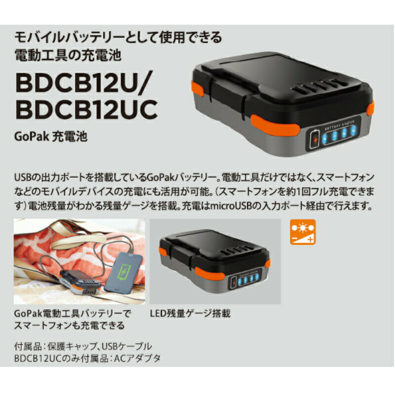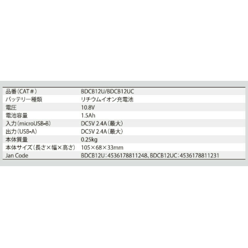 10.8Vリチウムイオン充電池 ○GoPakシリーズ共有バッテリー ○LED残量ゲージ ○USB-A 出力ポート ○microUSB-B 入力ポート ■商品仕様 品番 BDCB12U/BDCB12UC 電圧:10.8V 電池容量:1.5Ah 入力 (microUSB-B):DC5V 2.4A (最大) 出力 (USB-A):DC5V 2.4A (最大) 本体質量:0.25kg 本体サイズ (長さ×幅×高さ):105×68×33mm Jan Code:BDCB12U:4536178811248 BDCB12UC:4536178811231