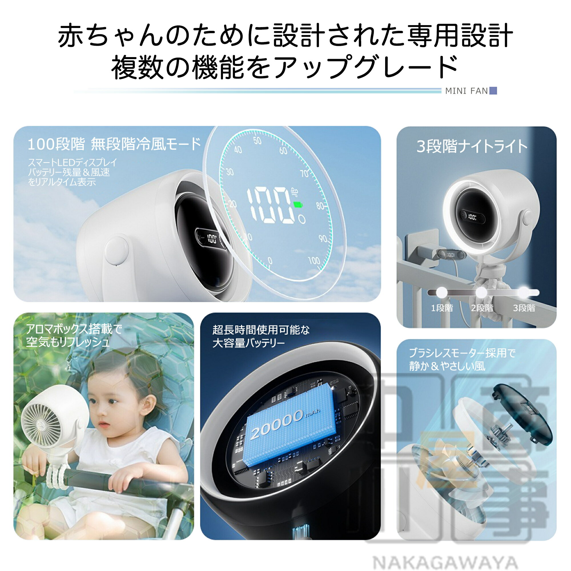 360°角度調節×100段階風量×3段階調光で赤ちゃんも安心!20000mAh大容量バッテリーでアウトドア/車内/卓上まで、熱中症対策に最適な静音ポータブルファン♪今夏の必須アイテム!