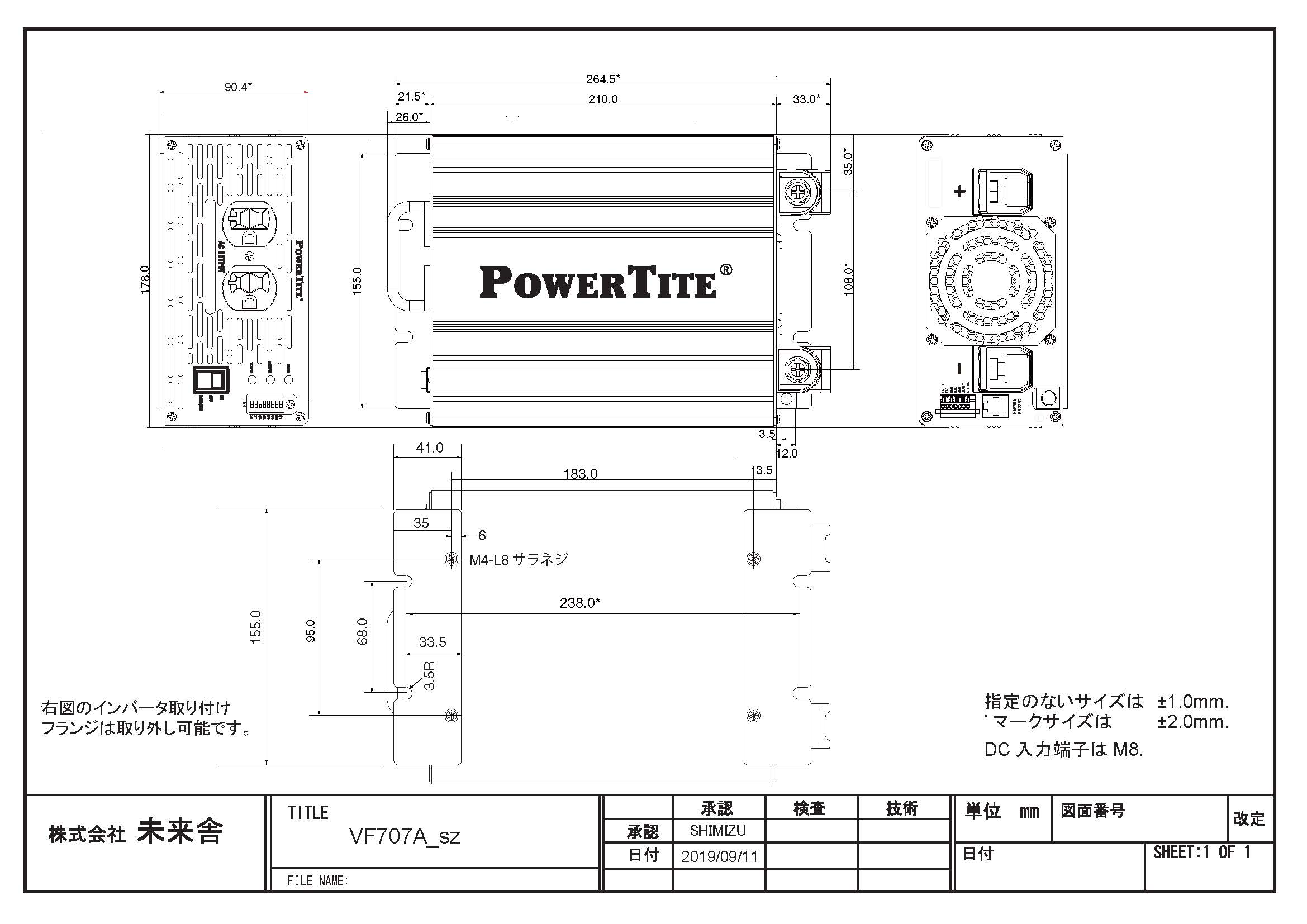 AC100V出力 業務用 DC-ACインバーターVF707A ターボモード搭載 堅牢小型 仕様書に記載されていますように非常に高性能です VFインバータの特徴 ・突入電流に強い ・DC逆接保護機能装備 ・AC逆流保護機能装備 ・動作温度範囲が広い:-20℃ 〜 60℃(40℃以上低減特性 ■業界初、インバーターのAC出力に誤って商用交流を入力し逆流させても保護するAC逆流保護 ■クラス初、入力DCの極性を逆に接続しても保護するDC逆接保護 ■DC入力範囲が広く、リチウムバッテリーにも対応 ■一時的に120%出力を可能にするターボモード ■入力DC電圧低下による出力遮断/復帰値をディップスイッチで2種類切替可能※1 ■出力AC電圧、周波数をディップスイッチで切替可能※1 ※1 RS-232Cを使用すると内容の変更が可能となります。 出力電圧・出力周波数DIPスイッチ切換可 広い動作温度範囲 パワーセーブモード機能で低負荷時の節電可能 住宅のコンセントと同じ正弦波が使えます!あれこれいつもの家電が安心して使える! ・業務用にお勧めの耐久性 ・エアコン、モーターなどを使用する際にお勧めの強力なDCACインバーター ・キャンピングカービルダーに選ばれる強力なインバーター [仕様] 700W 定格出力電圧(切換可) : AC 100/110/115/120V (DIP SW 切替) 97V - 128V(※1) 周波数(切換可) : 50/60(DIP SW 切替) 周波数安定度 : ± 0.03% 出力波形 : 正弦波(THD 最大効率 : 89% 無負荷電流 : 0.9A 入力電圧範囲 : 10.5V - 17.0V 保護回路 : 入力逆接 / 入力過電圧 / 低電圧遮断、 過温度、 過負荷、 AC 出力短絡 動作温度範囲※1 : -20℃ 〜 60℃(40℃以上は低減特性) 保存温度、湿度範囲 : -30℃ 〜 70℃ 冷却 : 吸気式強制冷却ファン(負荷および温度制御) 寸法(WxHxD) : 178.0 x 88.4 x 210.0mm(突起部含まず) 重量 : 2.4kg [PDF資料] 正弦波 700W DC12V>AC100V インバータ 未来舎 パワータイト(Power Tite) VF707A-12VDC-100VAC オプション REMO-781 REMO-702 ------------------------------------------------------- ◆ 購入時に防錆加工オプションを追加できます ・防錆加工 (VF607A VF707A VF1007A VF1507A) ・防錆加工 (VF2007A VF3007A) 船舶や湿度の高い場所、錆の発生しやすい場所などでの使用の際に適した加工です。 船舶でインバーターを使用しますと、内部回路などがサビや腐食により修理不能となる場合がございます。この防錆加工を施すことで内部の回路などを守り故障に強くなります。 船舶や錆を起こしやすい場所での使用を想定されている場合に強くおすすめしています。*必ず錆が防げるわけではございません。錆が発生した場合の保障はございませんのでご理解ください ------------------------------------------------------- ◆ 購入時にノイズ低下加工オプションを追加できます ◆ノイズ低下 LOW-NOISE 加工 (対応機種:VF1507A VF3007A) 漁船やキャンピングカーなどで、ノイズが気になる場合にお勧めしております。好評をいただいておりますが、ノイズがなくなるわけではございません。保証はございませんのでご了承ください。 ------------------------------------------------------- 未来舎インバーター【VF シリーズ】の主な特徴 ・ターボモード搭載 出力120%まで過負荷判定にならず出力できます 〇 DC入力逆接保護機能 業務用の大電力でこの機能は他にありません ワニ口クリップで電池と接続する時+/-を間違えても安心です。 例えば、屋外でバッテリーに頻繁に接続しなおす使用方法で、極性を間違えても壊れません。 〇AC出力逆流保護機能 大電力の素子より可能でリレー切換え時の火花放電に耐えるので耐久性もさらに向上しています。 この機能は他に見つけられません。 ★未来舎パワータイトとは、1980年より営業している東京の会社でです。社内の対応が迅速で、修理・故障の対応が早くて安心です。 未来舎パワータイトの製品は、大手民間メーカー、官公庁で使用されています。 例)自衛隊、官公庁、放送局、警察署通信課、防災ヘリ航空会社、車製造架装会社、特殊車両製造会社、全国ネットの電話基幹設備会社、風力発電、電池メーカー ■業界初、インバーターのAC出力に誤って商用交流を入力し逆流させても保護するAC逆流保護 ■クラス初、入力DCの極性を逆に接続しても保護するDC逆接保護 ■DC入力範囲が広く、リチウムバッテリーにも対応 ■一時的に120%出力を可能にするターボモード、ターボモード時 120%使用可能 ■入力DC電圧低下による出力遮断/復帰値をディップスイッチで2種類切替可能※1 ■出力AC電圧、周波数をディップスイッチで切替可能 ※RS-232Cを使用すると内容の変更が可能となります。 ■入力低電圧遮断電圧 / 復帰電圧 2種類切り替え入力遮断 / 復帰電圧変更可能 *1 ■広い入力電圧範囲 ■ECO モード ■出力電圧、 周波数スイッチ切替AC 100/110/115/120V (DIP SW 切替)97V - 128V(※1)、 50/60Hz ■良質な正弦波 ( 歪率 2.5% 以下 ) を出力 ■出力電圧安定度 ± 5% ■各種保護機能 *2 :入力逆接、 入力低電圧 / 過電圧過負荷 /AC 出力短絡、 AC 逆流過温度 ■AC ケーブル固定金具装備 *1 RS-232C による設定が必要です。 *2 保護機能は 100% 保証するものではありません。 ■保護と遮断 