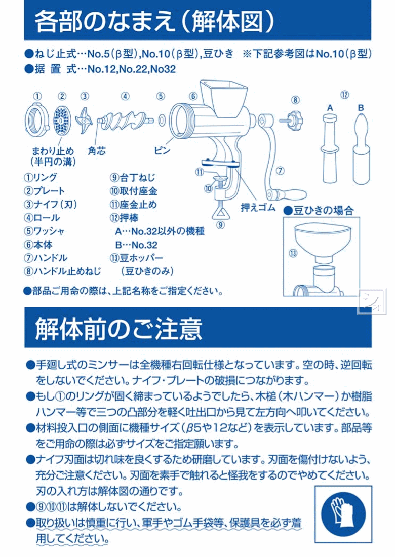 商 品 説 明 仕様 据付式 能力 約25kg/1時間 サイズ (約)横幅250×奥行120×高さ170mm 重量 約4.5kg 投入口の大きさ(だ円さし渡し) 115mm×100mm 出口の径 69mm プレートの穴径 3.2mm ※その他プレートを同時購入の方は、画像(プレート目(穴)と用途)をご参照ください。 表面仕上げ 錫メッキ 特長 ●牛肉・豚肉・鶏肉などの一般肉類・魚・えび・いか類の細断・味噌豆ひき・海苔挽き・餡挽潰し等、幅広くご使用になれます。●ご家庭でミンチ肉や味噌をお作りください。●健康に害を及ぼす防腐剤などの入っていない、ヘルシーな手作り料理を楽しめます。また、レストラン・製餡など業務用にもお使いになれます。 製造 日本 メーカー ボニー 関連ワード: ミートミンサー ミンチ機 ひき肉 挽肉 Bonny 【関 連 商 品】 プレート 穴径1.2mm プレート 穴径1.6mm プレート 穴径1.9mm プレート 穴径2.4mm プレート 穴径3.2~16mm 右 ハードナイフ ウインナーメーカー No.10・12 ミートミンサー用 牛肉、豚肉、鶏肉などの一般肉類、魚、えび、いか類の細断、味噌豆ひき、海苔挽き、餡挽潰し等、 幅広くご使用になれます。 ご家庭でミンチ肉や味噌をお作りください。 健康に害を及ぼす防腐剤などの入っていない、ヘルシーな手作り料理を楽しめます。 また、レストラン、製餡など業務用にもお使いになれます。