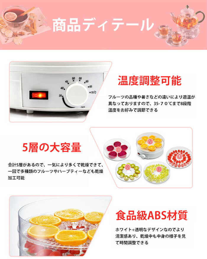 商品詳細 商品情報 商品名:食品乾燥機 定格電圧:110V 消費電力:345W 毎層高さ:合計5層(各層の高さは45mm) 温度調整可能範囲:35-70℃、8段階調整 サイズ:280*280*320mm ご注意 ・カラーについて お品物の色合いは、写真撮影、パソコン画面表示等の環境の違いにより、 若干異なる場合がございますので予めご了承くださいませ。 ・サイズについて サイズは手作業で測定しておりますので、若干の誤差が生じる場合がございます、ご了承ください。 ・在庫・発送について 土日・祝日は休業日とさせて頂いております。 弊店は発送時間の指定を承っておりませんので、ご了承ください。