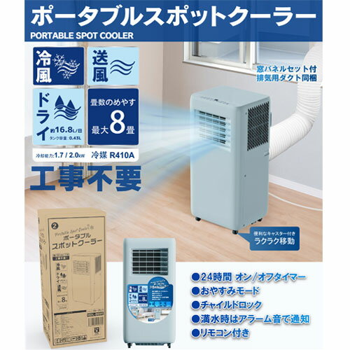 【必ずお読みください】お届け先の氏名に必ず法人名・屋号を記載ください。なお個人のお客様でもお届け先の氏名が法人名であればご注文いただけます。誤ってお届け先の氏名を個人名でご注文いただいた場合は、キャンセルさせていただきますのでご了承ください。取付工事が不要のポータブルスポットクーラーです。一時的に部屋を涼しくしたいキッチンやガレージなどに移動して簡単に使用できます。キャスター付きで移動もラクラク。運転モードは「冷風」・「ドライ(除湿)」・「送風」を搭載しており、1台で3役をこなします。便利なリモコン付。【特長】●冷風運転風量は2段階(弱・強)で切替可能。温度は15〜31℃の間で1℃単位で設定可能です。●ドライ運転一日の最大除湿量は16.8Lです。風量切替と温度設定はできません。●送風運転風量は2段階(弱・強)で切替可能ですが、温度設定はできません。●おやすみモード冷風運転時のみ、おやすみモードが設定できます。就寝時に設定すると、1時間後に設定温度から1℃上昇、2時間後にさらに1℃上昇し、設定から6時間後に運転を停止します。再度「おやすみ」ボタンを押すと、「おやすみ」ランプが消灯しておやすみモードが解除されます。●タイマー運転停止までの時間を設定する「オフタイマー」と、運転開始までの時間を設定する「オンタイマー」があります。オフタイマーとオンタイマーは1〜24時間の範囲で1時間ごとに設定できます。●チャイルドロックお子様のいたずらによる事故を防ぐため、ボタンの操作を無効にします。運転中に操作部の「チャイルドロック」ボタンを押すとランプが点滅し、全ボタンの操作が無効になります。ボタンを長押し(5秒)すると解除できます。●窓パネル付き窓パネルの組み合わせで、窓の高さが約88〜1117cm、124〜173cmまで取り付け可能。88cm未満、118〜124cm未満、173cm以上の窓枠には設置できません。排気ホースと窓パネルを適切に利用することにより、排熱と換気を同時にすることができます。【ご注意】●水平で安定した場所に設置してください。●製品の周囲は上面30cm以上・前方20cm以上・後方60cm以上・吸気口側60cm以上あけて設置してください。●本製品の重量は約20kgです。本体の重さに耐える場所に設置してください。●アース線を接続してください。・機器を接地しないで使用すると感電するおそれがあります。・ガス管、水道管および電話や避雷針のアースなどにアース線を接続しないでください。・アース端子がない場合は、別途アース工事(D種設置工事)が必要です。業者に依頼してください。●本製品は排気ホースを設置しなくても使用することができます。ただし閉め切った部屋では、排気ホースを取り付けないで運転を行うと、排気口からの排熱により室温が上昇する場合があります。●本製品は部屋全体を冷やす冷房機ではありません。スポット冷風機のため、部屋全体を冷房することには適していません。■商品詳細メーカー名:ヒロ・コーポレーションサイズ:本体:約W330×D280×H685mm、排気ホース:約φ154×L240〜1500mm、ドレンホース:約φ10×L1000mm電源コード長:約1.8m重量:約19.5kgカラー:ブルーグレー適用畳数:最大8畳運転モード:冷風・ドライ・送風風量切替:2段階 (弱・強)タイマー:1〜24時間 (1時間単位)除湿能力:最大16.8L/日運転音:≦65dBA ※冷風運転(強)使用時冷媒:R410A冷媒封入量:260g電源:AC100V (50Hz・60Hz)定格消費電力:50Hz:650W、60Hz:750W付属品:排気ホース、ジョイント、ドレンホース、ノズル、窓パネルセット(パネル(A・B・C各1)、パネル固定用金具一式(固定金具、ワッシャー、蝶ナット各2)、リモコン、取扱説明書メーカー保証期間:1年間購入単位:1台配送種別:直送品 代引不可 返品不可 配送日時指定不可※商品はメーカーより直送させて頂くため、代金引換でのご注文はお受け致しかねます。※こちらの商品は他の商品とは別のお届けとなります。※メーカー直送のため、納品・請求書は商品とは別に郵送させていただきます。※商品はメーカーより直送させて頂くため、ご希望配送日時の指定はできません。※メーカーにて欠品発生時はこちらからご連絡させて頂くこともございます。※お客様都合による返品・交換はお受けしておりません。※沖縄・離島は送料別途見積りとなります。※リニューアルに伴いパッケージや商品名等が予告なく変更される場合がございますが、予めご了承ください。※モニターの発色具合により色合いが異なる場合がございます。【検索用キーワード】4562350999695 P95347 HDL-9695 HDL8797 ヒロ・コーポレーション HIRO ポータブルスポットクーラー ブルーグレー ブルー 青色 青 グレー ヒロ・コーポレーション ヒロコーポレーション ヒロ ポータブルクーラー スポットクーラー コンパクトクーラー パーソナルクーラー 小型クーラー 持ち運びクーラー スポットエアコン クーラー 冷風機 冷風扇 エアコン 冷専 冷房 専用 工事不要 設置 取付 簡単 冷風 ドライ 除湿 送風 部屋干し 衣類乾燥 家庭用