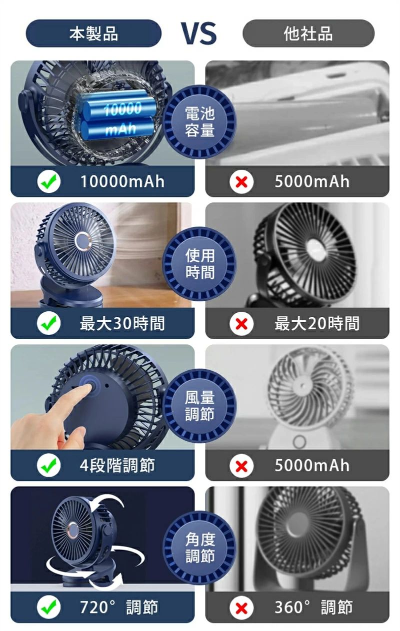 クリップファン 7200mAh超大型バッテリー|最大24時間連続稼働|360°手動チルト調節|4段階風量|卓上/アウトドア両用|ホワイト/ブルー/ブラック/グリーン/ローズピンク