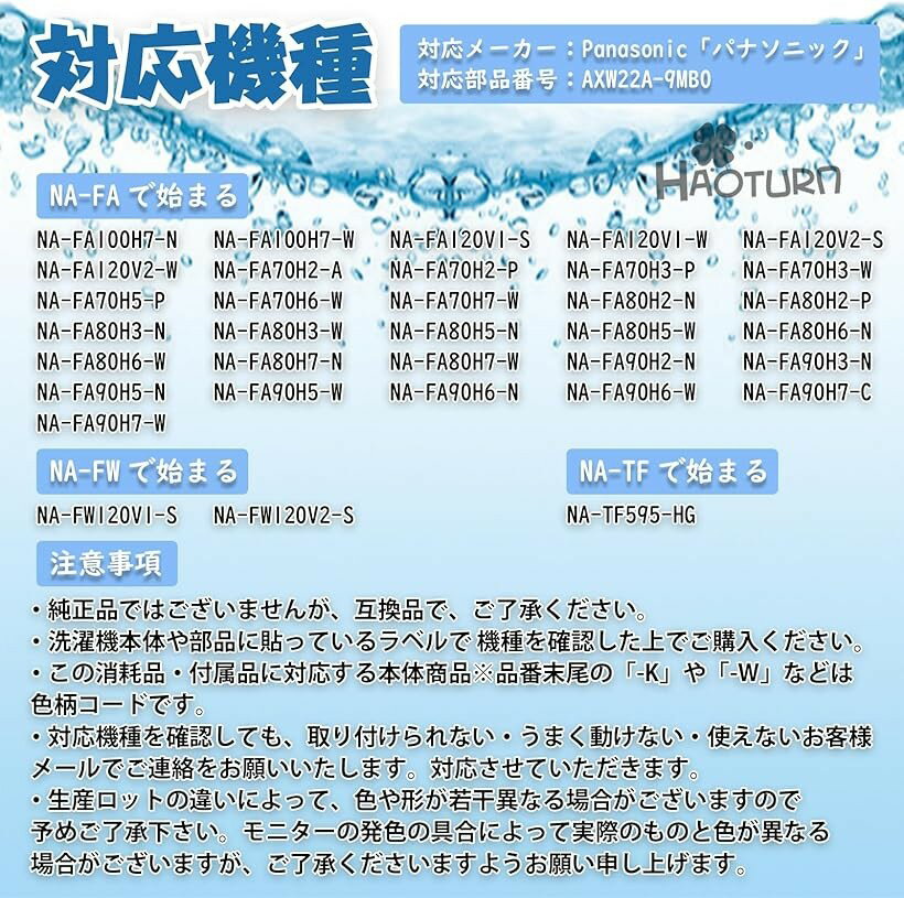 商品コード2bu8kfj0it商品名AXW22A-9MB0 糸くずフィルター 使い捨て ゴミ取りフィルター パナソニック 糸屑フィルター フィルター 洗濯機 糸くず くず取り 6枚入りブランドHAOTUNRカラー青「お手入れラク」 使い捨てゴミ取りフィルター を洗濯機の糸くずフィルターにセットするだけで髪の毛や細かなゴミをキャッチ、汚れたら触らずにポイ捨てできる手軽さで、ベトベト汚れとの接触や歯ブラシ掃除から解放され、洗濯機を常に清潔に保つ便利アイテム。専用モデル パナソニック AXW22A-9MB0 糸くずフィルター に最適なサイズでカット不要、洗濯機を常に清潔に保つストレスフリー設計。「対応機種1」 NA-F10AH7J 、 NA-F50B10 、 NA-F50B10C 、 NA-F50B11 、 NA-F50B11C 、 NA-F50B12 、 NA-F50B12J 、 NA-F50B13 、 NA-F50B13J 、 NA-F50B9 、 NA-F50B9C 、 NA-F50BE5 、 NA-F50BE6 、 NA-F50BE7 、 NA-F50ME3 、 NA-F50ME4 、 NA-F60B10 、 NA-F60B11 、 NA-F60B12 、 NA-F60B13 、 NA-F60B9 、 NA-F60PB10 、 NA-F60PB11 、 NA-F60PB12 、 NA-F60PB13 、 NA-F60PB9 、 NA-F70BE5 、 NA-F70BE6 、 NA-F70PB10 、 NA-F70PB11「対応機種2」 NA-F70PB12 、 NA-F70PB13 、 NA-F70PB9 、 NA-F7AE3 、 NA-F7AE4 、 NA-F7AE5 、 NA-F7AE6 、 NA-F8AE3 、 NA-F8AE4 、 NA-F8AE5 、 NA-F8AE6 、 NA-F8AE7 、 NA-F9AE3 、 NA-F9AE4 、 NA-F9AE5 、 NA-F9AE6 、 NA-F9AE7 、 NA-FA100H7 、 NA-FA120V1 、 NA-FA120V2 、 NA-FA70H2 、 NA-FA70H3 、 NA-FA70H5 、 NA-FA70H6 、 NA-FA70H7 、 NA-FA80H2 、 NA-FA80H3 、 NA-FA80H5 、 NA-FA80H6 、 NA-FA80H7 、 NA-FA90H2 、 NA-FA90H3 、 NA-FA90H5 、 NA-FA90H6 、 NA-FA90H7 、 NA-FW120V1 、 NA-FW120V2 、 NA-TF595「対応品番」 パナソニック AXW22A-9MB0 糸くずフィルター 、 使い捨てゴミ取りフィルター 。「パッケージ内容」AXW22A-9MB0 2個 & 使い捨て ゴミ取りフィルター 4枚 。「強化メッシュで耐久性UP&しっかりキャッチ」高品質ナイロンメッシュが破れにくく長寿命でコストパフォーマンス向上に加え、微細な糸くずや髪の毛をしっかりキャッチ。排水効率を保ち詰まりを防ぐことで、洗濯機トラブルを軽減します。「Panasonic 糸くずフィルターの交換について」糸くずフィルターが目詰まりしていると水が通過しにくくなる。目詰まりが取れにくい場合は水につけてお手入れをしてください。特に、衣類に糊付けをされている方は目詰まりを起こしやすくなる。また、糸くずフィルターは定期的に交換するのがおすすめ。洗っても取れない汚れやネットのほつれが気になったら、新しいものに交換しましょう。※ 他ネットショップでも併売しているため、ご注文後に在庫切れとなる場合があります。予めご了承ください。※ 品薄または希少等の理由により、参考価格よりも高い価格で販売されている場合があります。ご注文の際には必ず販売価格をご確認ください。※ 沖縄県、離島または一部地域の場合、別途送料の負担をお願いする場合があります。予めご了承ください。※ お使いのモニタにより写真の色が実際の商品の色と異なる場合や、イメージに差異が生じることがあります。予めご了承ください。※ 商品の詳細(カラー・数量・サイズ 等)については、ページ内の商品説明をご確認のうえ、ご注文ください。※ モバイル版・スマホ版ページでは、お使いの端末によっては一部の情報が表示されないことがあります。すべての記載情報をご確認するには、PC版ページをご覧ください。