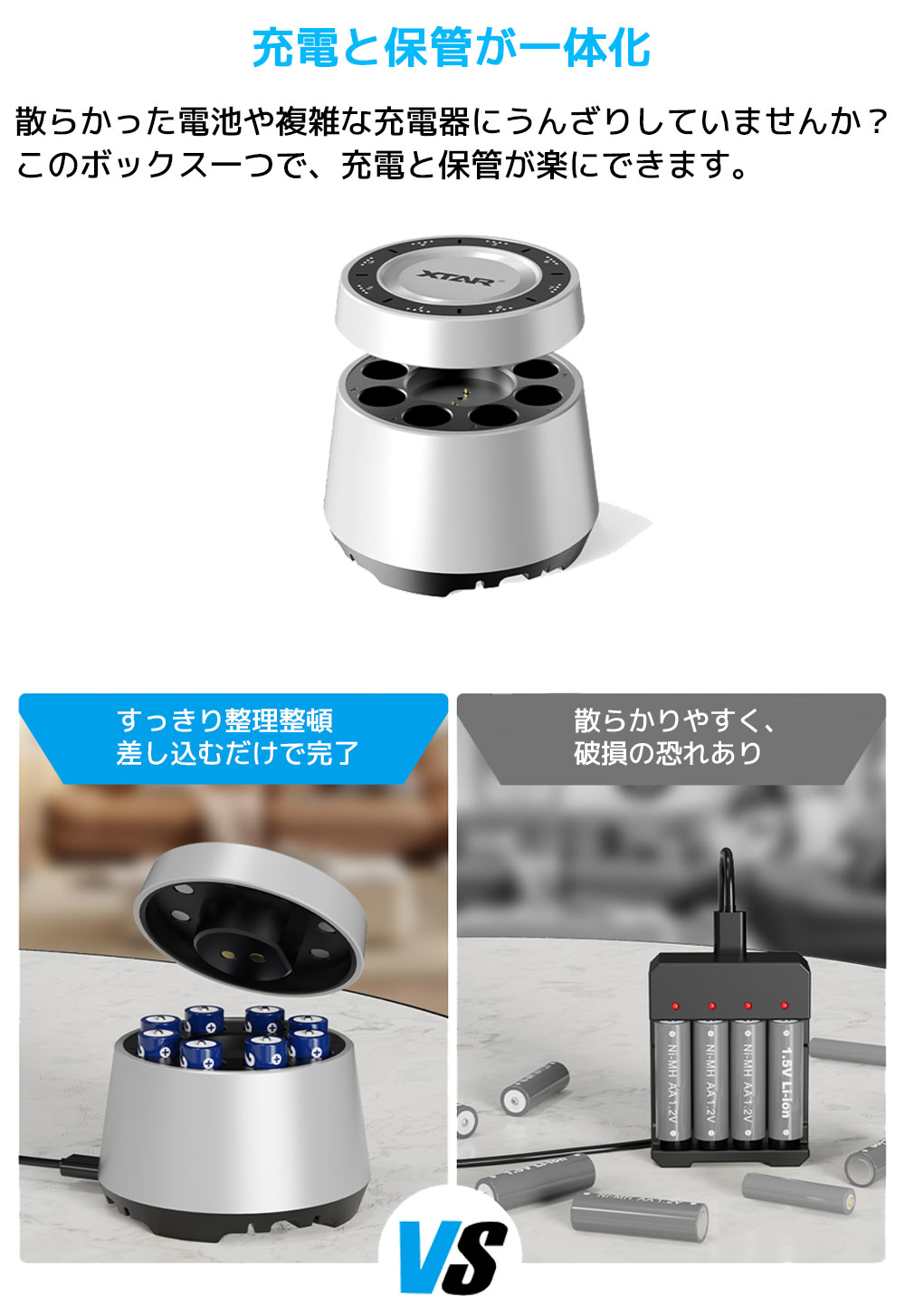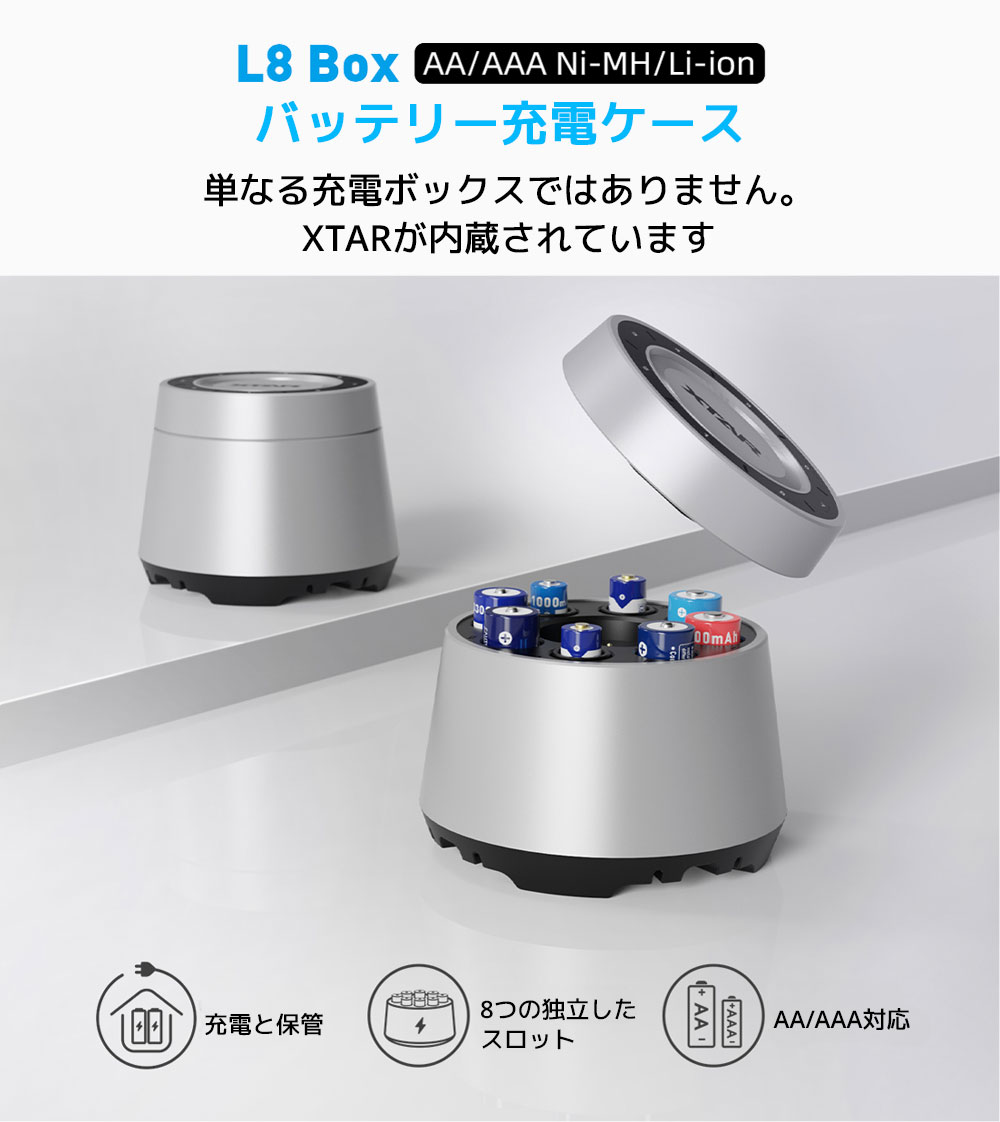 XTAR L8 Box 単3 単4 充電器 8本 エクスター 1.5V リチウムイオン 1.2V ニッケル水素 Ni-MH 電池 混合充電 単三 単四 AA AAA 対応 バッテリーチャージャー 急速 高速 充電 安全 小型 USB Type-C タイプC 過放電解除 8スロット 本物 正規品