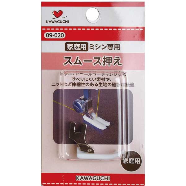 カワグチ スムース押え家庭用HA 09-020 商品コード:70520 入数:1 用途:ニット・合成皮革・ラミネート生地といった滑りの悪い素材の押さえ 対応機種:家庭用ミシン ※職業用・工業用ミシンには使用できません。 ニット・合成皮革・ラミネート生地といった滑りの悪い素材が驚くほどスムーズに縫えます。 あらゆる生地に適した万能タイプです。 テフロンが摩耗したらお買替えてください。 ※ジャノメ・ジューキ・エルナ・左基線(中央より左側に針が落ちる)、斜めに針が落ちるミシンは使用できません。お客様のミシンを確認の上お買い上げください。
