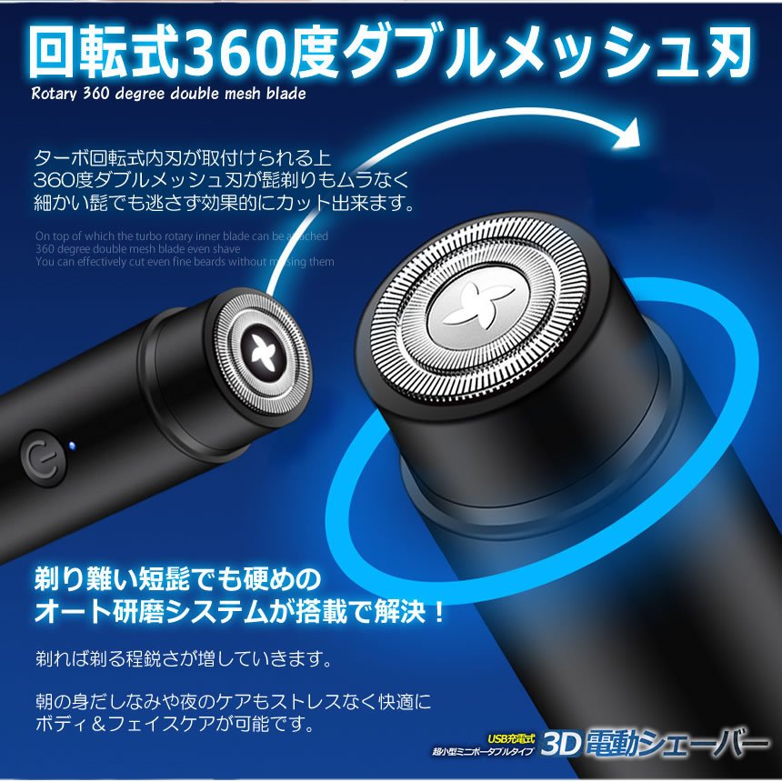 360度のメッシュ刃搭載 超小型&パワフルな「3D電動シェーバー」の登場です ターボ回転式内刃が取付けられる上 360度ダブルメッシュ刃が髭剃りもムラなく 細かい髭でも逃さず効果的にカット出来ます。 剃れば剃る程鋭さが増していきます。 朝の身だしなみや夜のケアもストレスなく快適に ボディ&フェイスケアが可能です。 IPX5レベル防水の仕様が採用されたことにより ウェット剃りでもドライ剃りでも 髭剃りの快適さも楽しめます。 USBの充電式で電池交換不要で どこでも簡単に充電可能です。 超コンパクトで持ち歩き簡単保障:輸入品の為、初期不良時のみの対応品となります【送料無料】メール便での発送予定となります