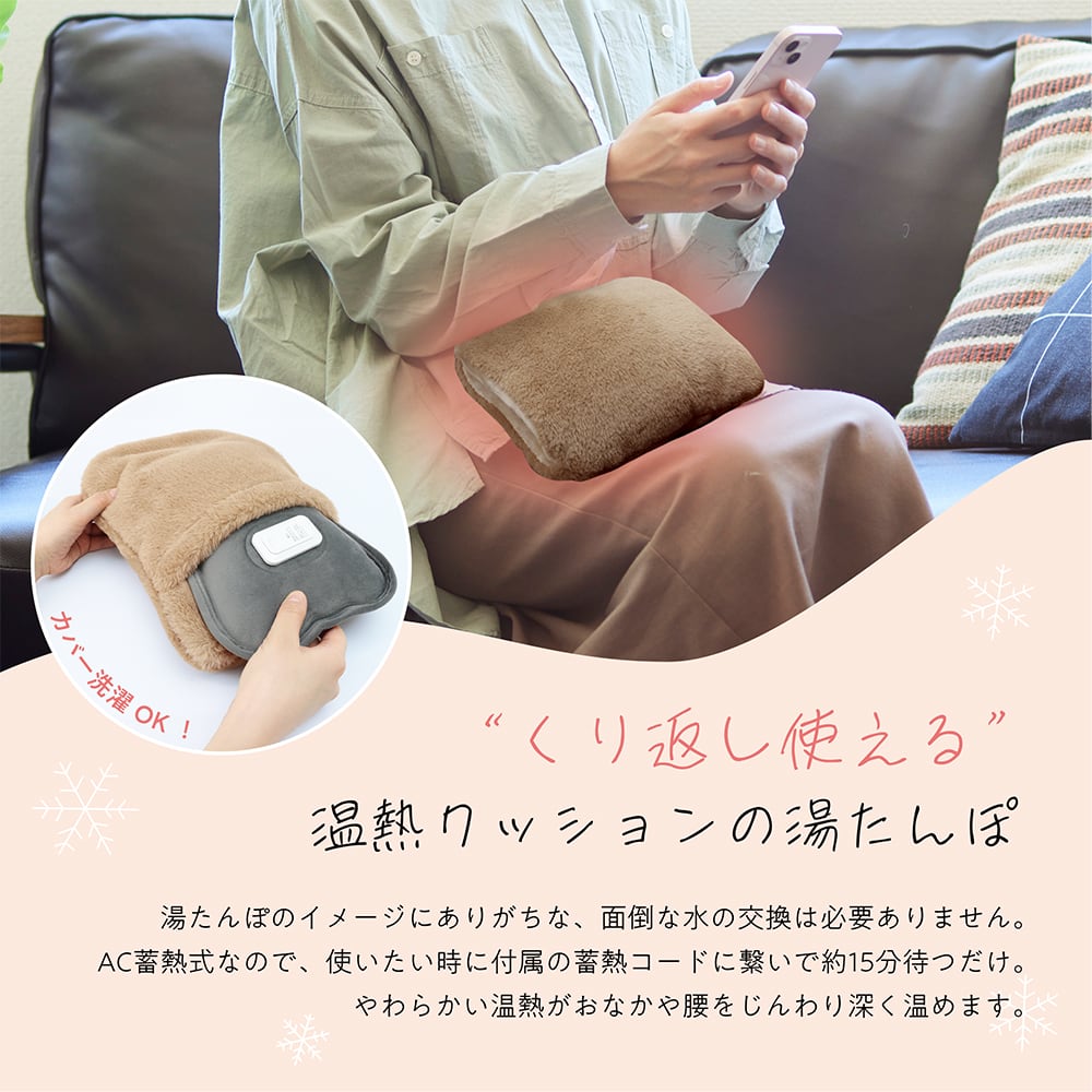 温熱クッションの湯たんぽ ポカリナ 水の交換も必要ない、繰り返し使える蓄熱式の湯たんぽ やわらかい温熱が大切なおなか・腰をじんわり深く温めます。 とろけるようなさわり心地のカバー付きカバーはもちろん洗濯可能 湯たんぽ本体/蓄熱コード 寸法 約W27.5×D4.5×H18.5cm (本体) コード 約68cm 重量 約1200g 個装重量 約1700g 材質 本体 : ポリエステル 蓄熱コード : PVC 銅 ABS アルミ 電源 AC100V 50/60Hz 消費電力 300W 温度 約70℃±5℃ ※環境により異なります。 蓄熱時間 約15分 ※環境により異なります。 温度ヒューズ 92℃ クッション 寸法 約W30×D5×H21cm (本体) 重量 約135g 材質 ポリエステル 品番 MES-75 JAN 4532141151076 ※WEB画像は実際の商品とは風合いが異なって見える場合があります。