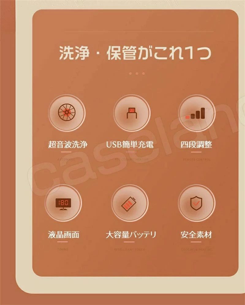 商品説明 替用ケース2個付きサイズ:約100*65*35mm重量:98g内蔵電源:リチウム電池充電方法:USBケーブル充電時間:約3-4時間動作時間:2/3/4/5分コース (1回の充電で90日ほどの使用が可能となります)1日1回の洗浄と仮定した場合動作原理:音波振動使い方STEP1: 洗浄ケースを本体から取り外します。STEP2: 洗浄ケースのキャップを外して、コンタクト用の洗浄液や精製水を注ぎます。7ml以上入れると、溢れて故障の原因になる場合がありますのでご注意ください。STEP3: キャップを締めて洗浄ケースを本体に戻し、台座にしっかりと固定します。STEP4: 洗浄開始ボタンを押して、自動停止するまで待ちます。商品詳細 【ミニ超音波洗浄器】超音波の原理を通じてレンズに付着するタンパク質の沈殿を急速に取り除き、長時間の浸漬も必要がない。ミニ超音波洗浄器 OKレンズ、ハードレンズ、ソフトレンズ、カラコンなどに適しています。【液晶画面】残り時間を液晶画面で確認できます。【コンタクトレンズをしっかり洗浄しないと…】巨大乳頭結膜炎や角膜浸潤など、さまざまな目のトラブルを引き起こすこともあります。また、涙腺たんぱく質は、レンズの表面などに長時間留まり、多数のバクテリアを繁殖させる原因にもなります。コンタクトレンズは毎日洗浄して、目の健康を守りましょう!【たった3分! こすり洗いはもう必要なし!】ハード、ソフト、カラコン、全てのレンズタイプに対応した超音波洗浄機!コンタクトレンズは、眼に直接つけるものだから、いつもキレイにしておきたいものです。超音波コンタクトレンズ洗浄機で、レンズのケア、お手軽に始めましょう!!【操作簡単&持ち運びが便利】特別なレンズケアソリューションを必要せず、手洗い不要。 小型且つ軽量でポケットに入れてどこに行っても、本製品はいつもお客様のそばにいます。 コンパクトで持ち運びやすいので、遠足、出張、キャンプ、野営などに最適です。注意事項 製品は防水製ではないので、本体、ボタン、充電口などに水が付着しないようにしてください。二つの清浄槽だけを洗浄し、ボタンと充電口を水に入れないでください。製品を使用完了したらバイ菌などの再生を防ぐ為に必ずや清浄槽の清潔と乾燥を保ってください。製品が壊れないよう、洗浄液を入れないまま製品を起動しないでください。製品へのダメージやバイ菌が伝染しないよう、水道水を洗浄槽に入れて洗浄するのはおやめください。産地:中国商品説明 替用ケース2個付きサイズ:約100*65*35mm重量:98g内蔵電源:リチウム電池充電方法:USBケーブル充電時間:約3-4時間動作時間:2/3/4/5分コース (1回の充電で90日ほどの使用が可能となります)1日1回の洗浄と仮定した場合動作原理:音波振動使い方STEP1: 洗浄ケースを本体から取り外します。STEP2: 洗浄ケースのキャップを外して、コンタクト用の洗浄液や精製水を注ぎます。7ml以上入れると、溢れて故障の原因になる場合がありますのでご注意ください。STEP3: キャップを締めて洗浄ケースを本体に戻し、台座にしっかりと固定します。STEP4: 洗浄開始ボタンを押して、自動停止するまで待ちます。商品詳細 【ミニ超音波洗浄器】超音波の原理を通じてレンズに付着するタンパク質の沈殿を急速に取り除き、長時間の浸漬も必要がない。ミニ超音波洗浄器 OKレンズ、ハードレンズ、ソフトレンズ、カラコンなどに適しています。【液晶画面】残り時間を液晶画面で確認できます。【コンタクトレンズをしっかり洗浄しないと…】巨大乳頭結膜炎や角膜浸潤など、さまざまな目のトラブルを引き起こすこともあります。また、涙腺たんぱく質は、レンズの表面などに長時間留まり、多数のバクテリアを繁殖させる原因にもなります。コンタクトレンズは毎日洗浄して、目の健康を守りましょう!【たった3分! こすり洗いはもう必要なし!】ハード、ソフト、カラコン、全てのレンズタイプに対応した超音波洗浄機!コンタクトレンズは、眼に直接つけるものだから、いつもキレイにしておきたいものです。超音波コンタクトレンズ洗浄機で、レンズのケア、お手軽に始めましょう!!【操作簡単&持ち運びが便利】特別なレンズケアソリューションを必要せず、手洗い不要。 小型且つ軽量でポケットに入れてどこに行っても、本製品はいつもお客様のそばにいます。 コンパクトで持ち運びやすいので、遠足、出張、キャンプ、野営などに最適です。注意事項 製品は防水製ではないので、本体、ボタン、充電口などに水が付着しないようにしてください。二つの清浄槽だけを洗浄し、ボタンと充電口を水に入れないでください。製品を使用完了したらバイ菌などの再生を防ぐ為に必ずや清浄槽の清潔と乾燥を保ってください。製品が壊れないよう、洗浄液を入れないまま製品を起動しないでください。製品へのダメージやバイ菌が伝染しないよう、水道水を洗浄槽に入れて洗浄するのはおやめください。産地:中国