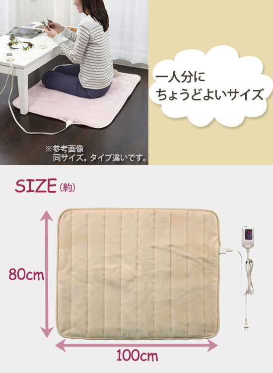 あったかパーソナルマット SB-HP900 80×100cm 一人用ホットカーペット 80×100cm 1人用にピッタリのコンパクトなあったかマットです。床に敷いたり、ソファーの上に置いたり。ベッドに置いて、足元用電気毛布として使うのもいいですね! コンパクトサイズで持ち運びにも便利。リビングでも寝室でも寒い季節に大活躍します。自分サイズにスポットで暖められるので、いつでも手軽に使えますね。こちらは、80cm×100cmの一人分サイズ。カラーはピンクとアイボリー、グリーンの3色。 あっかたポカポカ!自分用ホットカーペットです! あったかパーソナルマット SB-HP900 80×100cm の詳細 商品名 あったかパーソナルマット SB-HP900 80×100cm サイズ 80×100cm コード長:電源側1.9m+本体側1.0m 素材 表側:ポリエステル100%、裏側:ポリエステル100% 重量(約) 1.0kg 定格 55W 表面温度(約) 強:42℃、中:35℃、弱:23℃ 消費電力量(1時間)約 強:34Wh、中:17Wh、弱:2Wh 電気代(1時間)約 強:0.9円、中:0.5円、弱:0.1円 仕様 ダニ退治、室温センサー、丸洗いOK、切り忘れ防止タイマー(12時間自動OFFタイマー、2・4・6時間切りタイマー) メーカー 椙山紡織 区分 暖房器具 JAN アイボリー(IV):4571427035778 ピンク(P):4571427035785 グリーン(G):4571427035839 広告文責 (有)アテーネシステム 076-254-0238