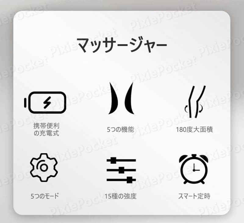 *尺寸?手工?量,如有?差,?属正常 ?品名称:小腿按摩器 主材??5V 1A ?定功率:3W 主机尺寸:220*120*90mm 生?国:中国 使用方法 ステップ01:マッサージャーをふくらはぎに装着して伸縮性を調整し、マジックテープを装着します。 スイッチを2秒長押すと電源入れる ステップ02:スイッチを押し、モードを選択する。EMS機能は5つのモードがある ステップ03:「+」か「−」を押すとEMS機能強度を調整する、15段階の段階がある ステップ04:個人状況により、温湿布/振動モードをオンにして15分間放置する 注意事項: 本製品の使用に適さない方 一. 足の神経に障害のある方 二.整形手術の部位、メタル、シリコン、プラスチックを填充した部位 三.妊娠・授乳中の方は使用しないでください 四.傷跡、湿疹、皮膚のしこりがある方は使用しないでください。 五. 1週間以内に脱毛や日焼けがあった場合は、使用しないでください。 六.器具には発熱面があります。熱に弱い人が使用する場合は注意が必要です。 七.初めてパルスマッサージャーを使用する方は、不快感を与えないように、最弱から徐々に強さを上げていった方がいい *使用前後には本体と電極を衛生的に保ち、消毒してください。 *傷口には使用しないでください。 *子供、妊婦、精神に異常のある人には使用しないでください。
