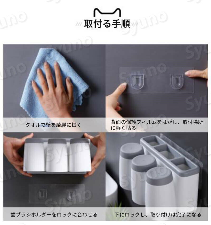 商品情報 商品名:壁掛けの歯ブラシホルダー 製品仕様:3つのカップタイプ 4つのカップタイプ 主な材質:ABS / TDR / PC 取付る手順 1.タオルで壁を綺麗に拭く 2.背面の保護フィルムをはがし、取付場所に軽く貼る 3.歯ブラシホルダーをロックに合わせる 4.下にロックし、取り付けは完了になる 産地:中国